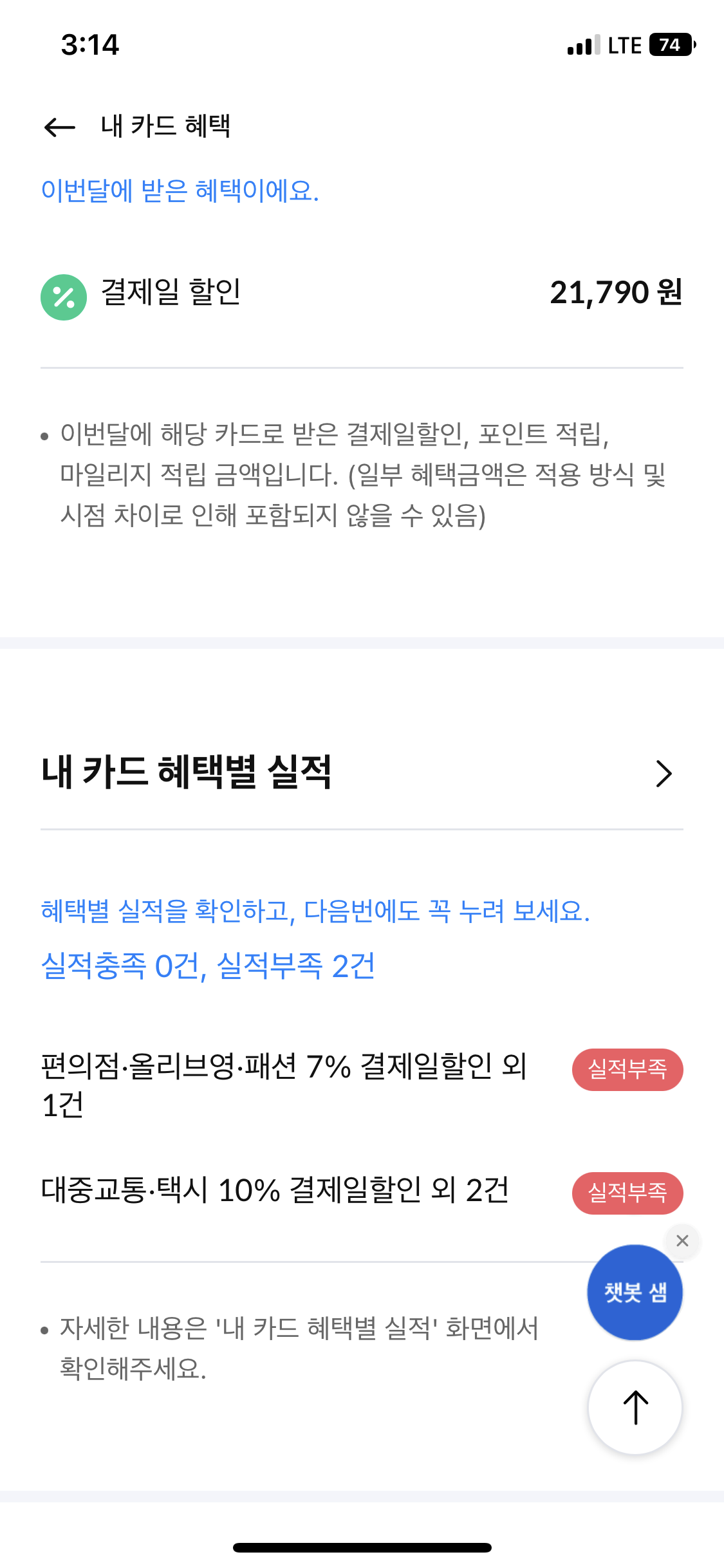 이것 또한 어플에서 확인할 수 있다. 탭탭오 혜택은 두가지 인데, 저 두가지 모두 전 달에 실적 인정금액이 30만원이 넘으면 된다. 나는 38만원 넘게 썼어도 실적이 충족되지 않았다. 왜냐하면 결제일할인 혜택을 받은 내역은 모두 실적이 인정되지 않기 때문이다.