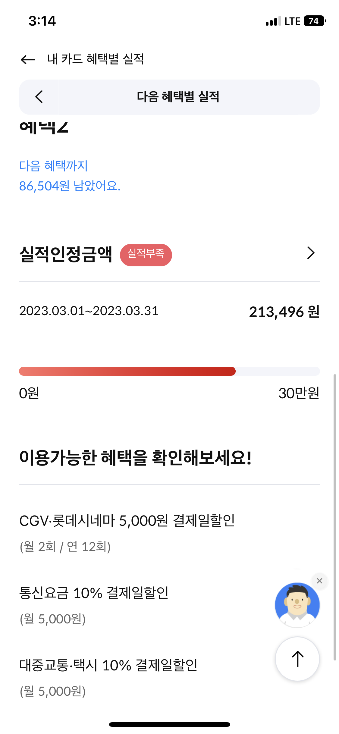 실적이 인정되는 금액은 21만원 정도니까 앞으로 팔만 얼마를 더 사용하면 된다. 팔만원 금방쓰지... 눈물...