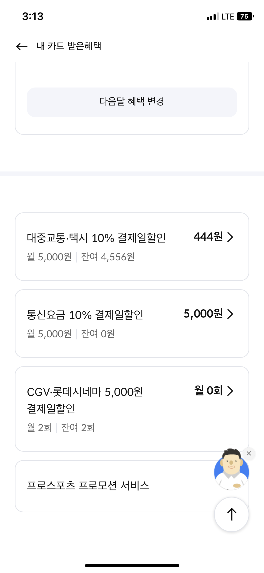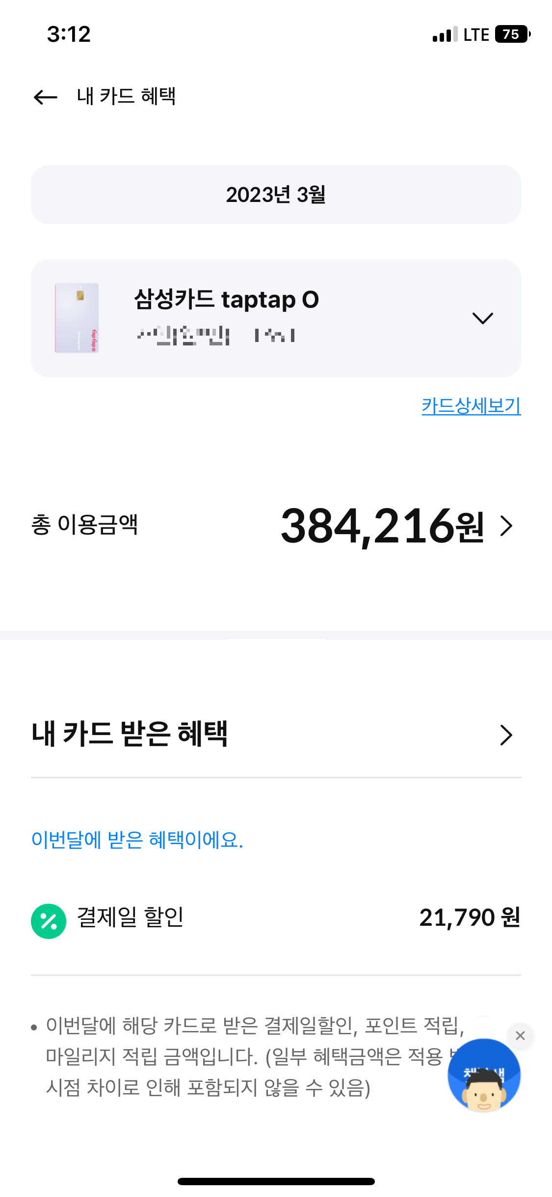 이번달 이용 금액이 딱! 먼저 보이고, 저 이용금액이 써져있는 파란박스를 누르면 내가 사용한 내역들과 받은 혜택을 볼 수 있다.