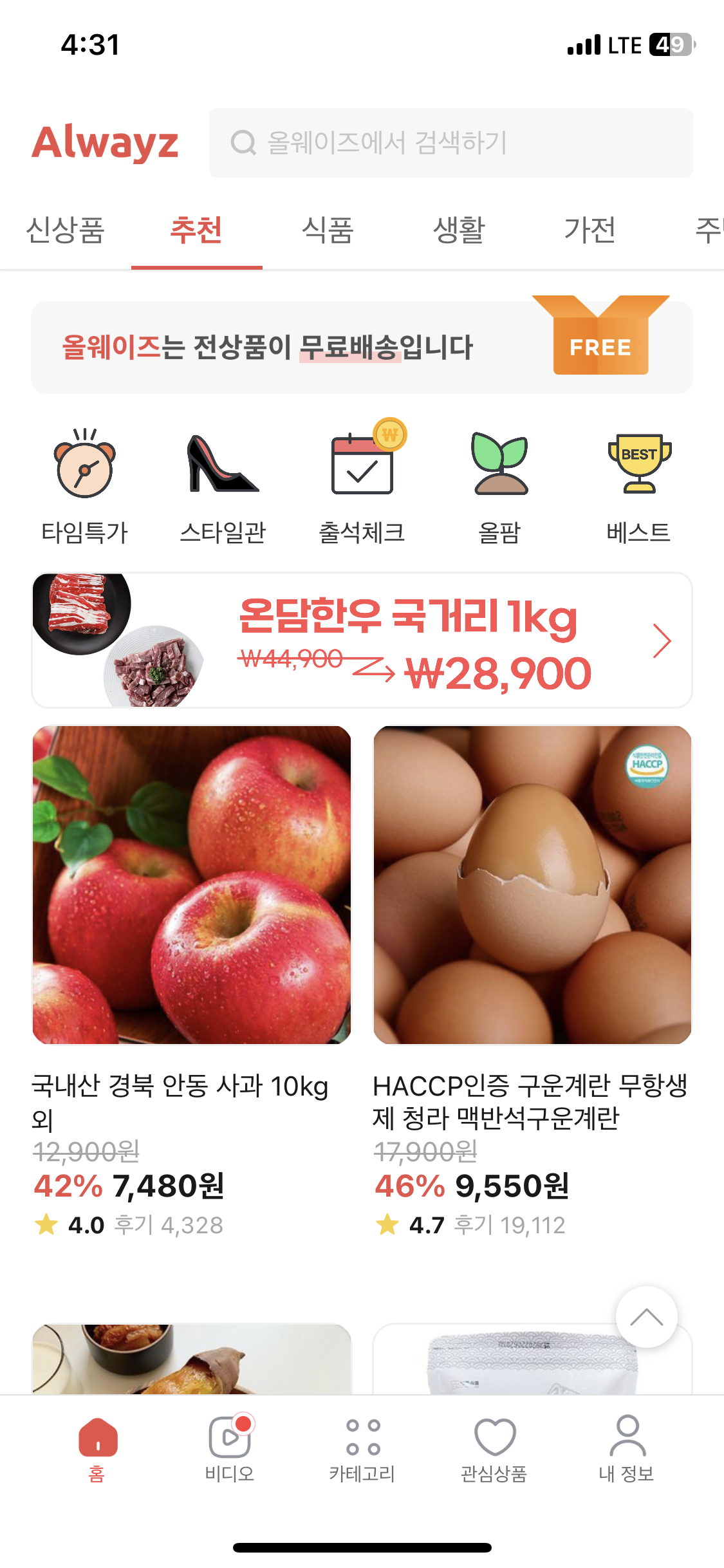 참고로 추천상품 60초 구경하는건 스크롤을 60초동안 내려야 한다. 그냥 켜놓고 있으면 시간이 줄어들지 않는다. 정말 광고를 보게끔 만든거같다. 허허.. 연어... 연어 사고싶더라...... 양말도 싸던데...