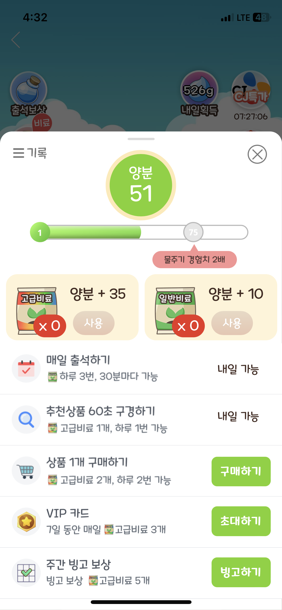 비료 받는 방법은 이렇게 매일 출석하기, 추천상품 60초 구경하기, 상품구매하기 등이 있다. 진짜 상품을 살까 고민하는 나를 보면서 친구가 너같은 사람들 덕분에 꽁짜로 사과받겠다더니 본인이 먼저 쇼핑했다. ㅋㅋㅋㅋㅋㅋ 어이없엉ㅋㅋㅋㅋㅋㅋ 추천상품 60초는 심지어 고급비료라서 이거는 꼭 해주는편..! ㅎㅅㅎ