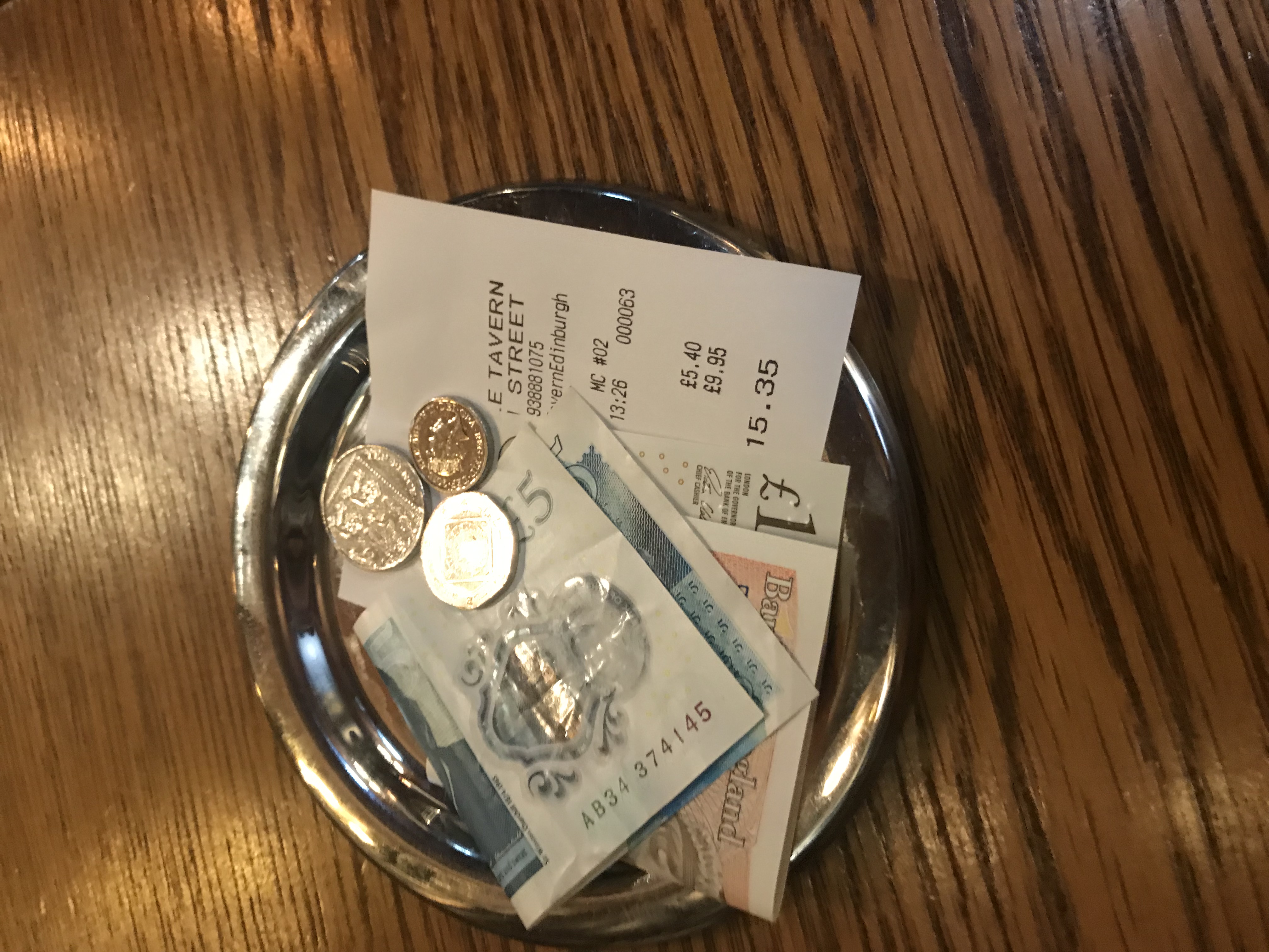 다 먹고나면, 직원에게 눈빛을 보내서 bill을 달라고 요청하면 저렇게 영수증과 작은 은접시를 줍니다. 그 위에 돈을 놓고 직원에게 전달해주면 된답니다. 하기스 하나에 맥주 한잔 해서 15.35 파운드가 나왔습니다. 약 23,000원 돈으로 전혀 아깝지 않은 돈이였어요. 그리고 계산 하면 박하사탕도 줬어요.