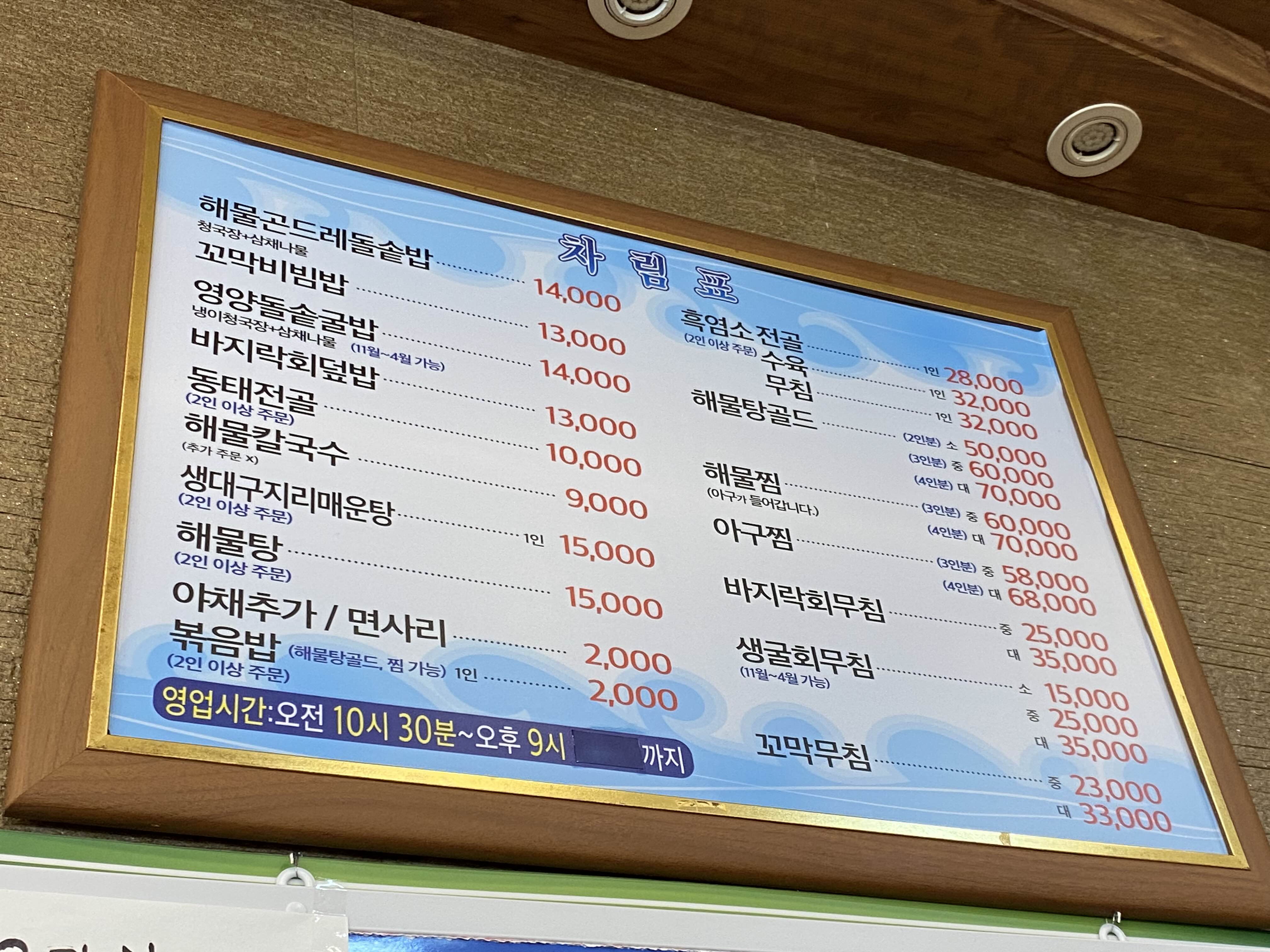 해물곤드레돌솥밥, 꼬막비빔밥, 영양돌솥굴밥, 바지락회덮밥, 동태전골, 해물칼국수, 생대구지리매운탕, 해물탕, 흑염소, 해물탕, 해물찜, 아구찜, 바지락회무침, 생굴회무침, 꼬막무침이 있다.