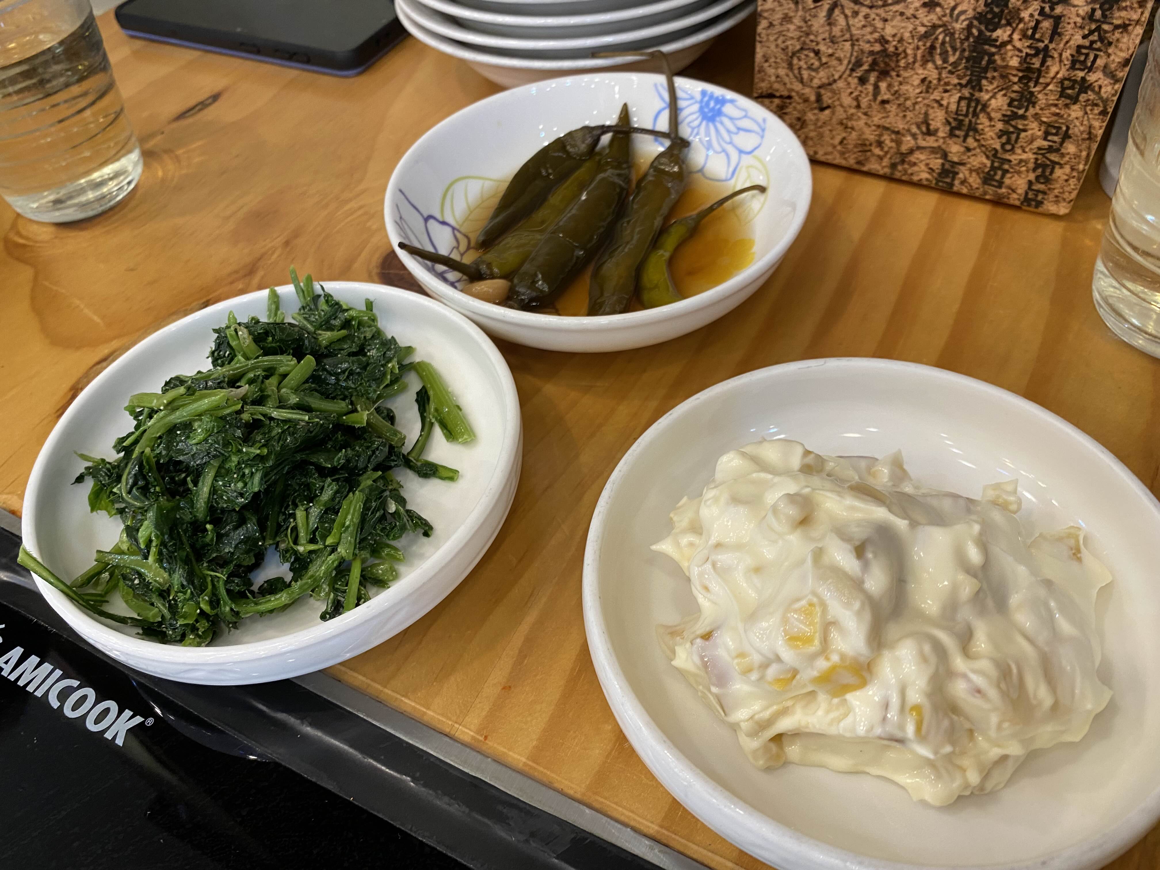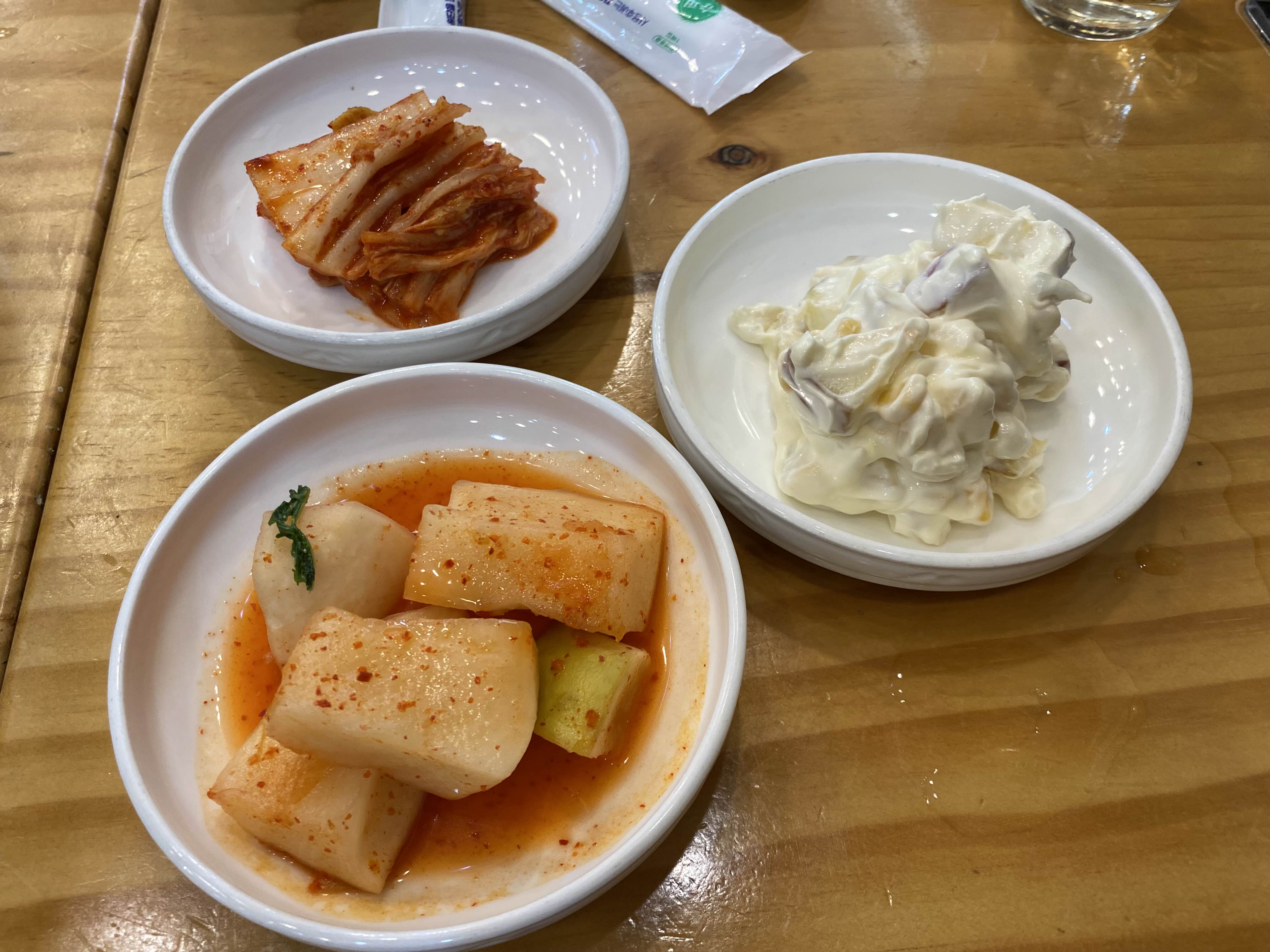 기본반찬은 깍두기, 김치, 사라다(진짜 옛날에 먹던 마요네즈 듬뿍 사라다!!!), 취나물, 고추장아찌가 나온다.