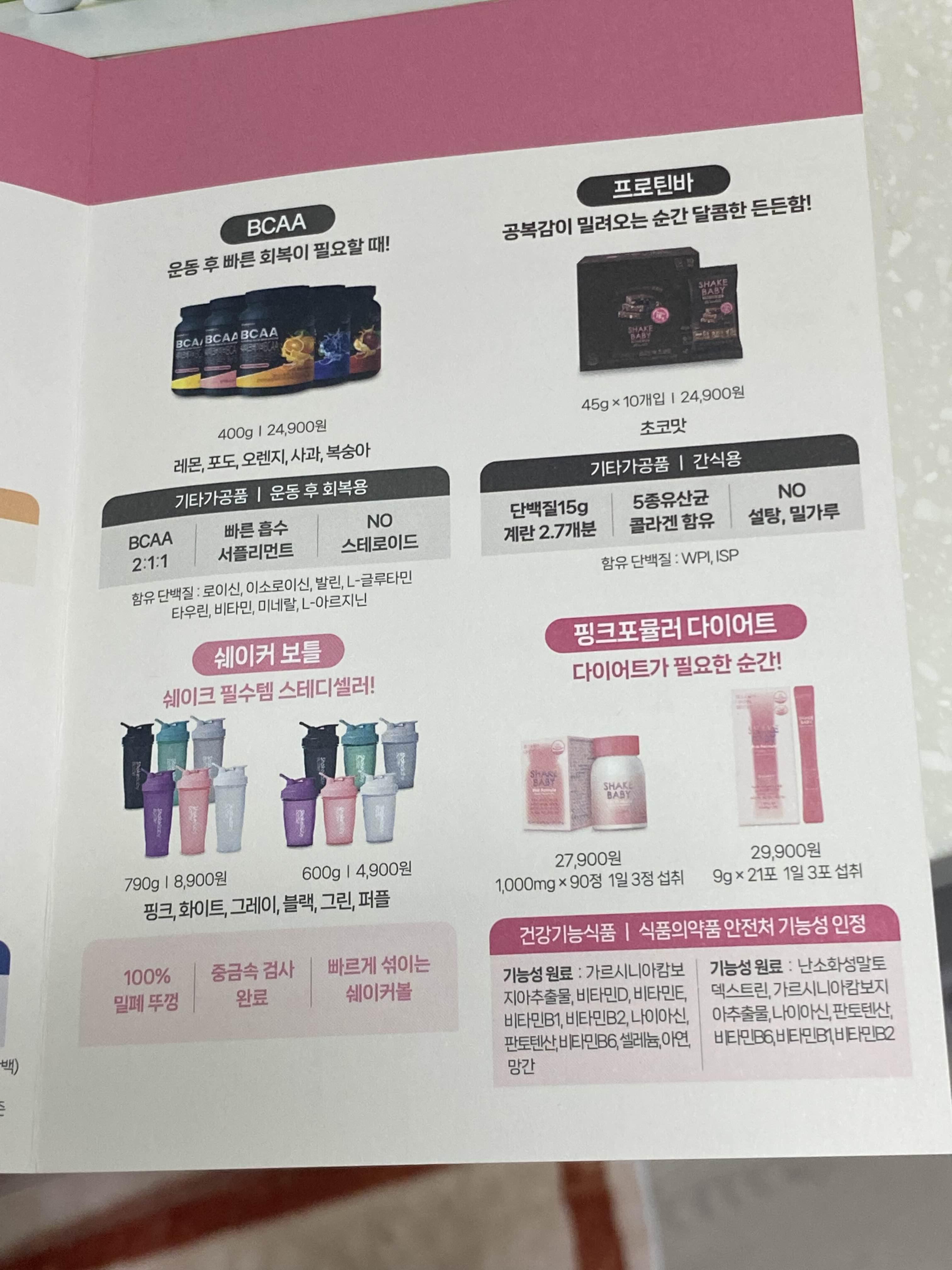 운동하면서 섭취하면 좋은 BCAA, 프로틴바, 다이어트를 위한 핑크포뮬러 다이어트 건강기능식품도 있다.