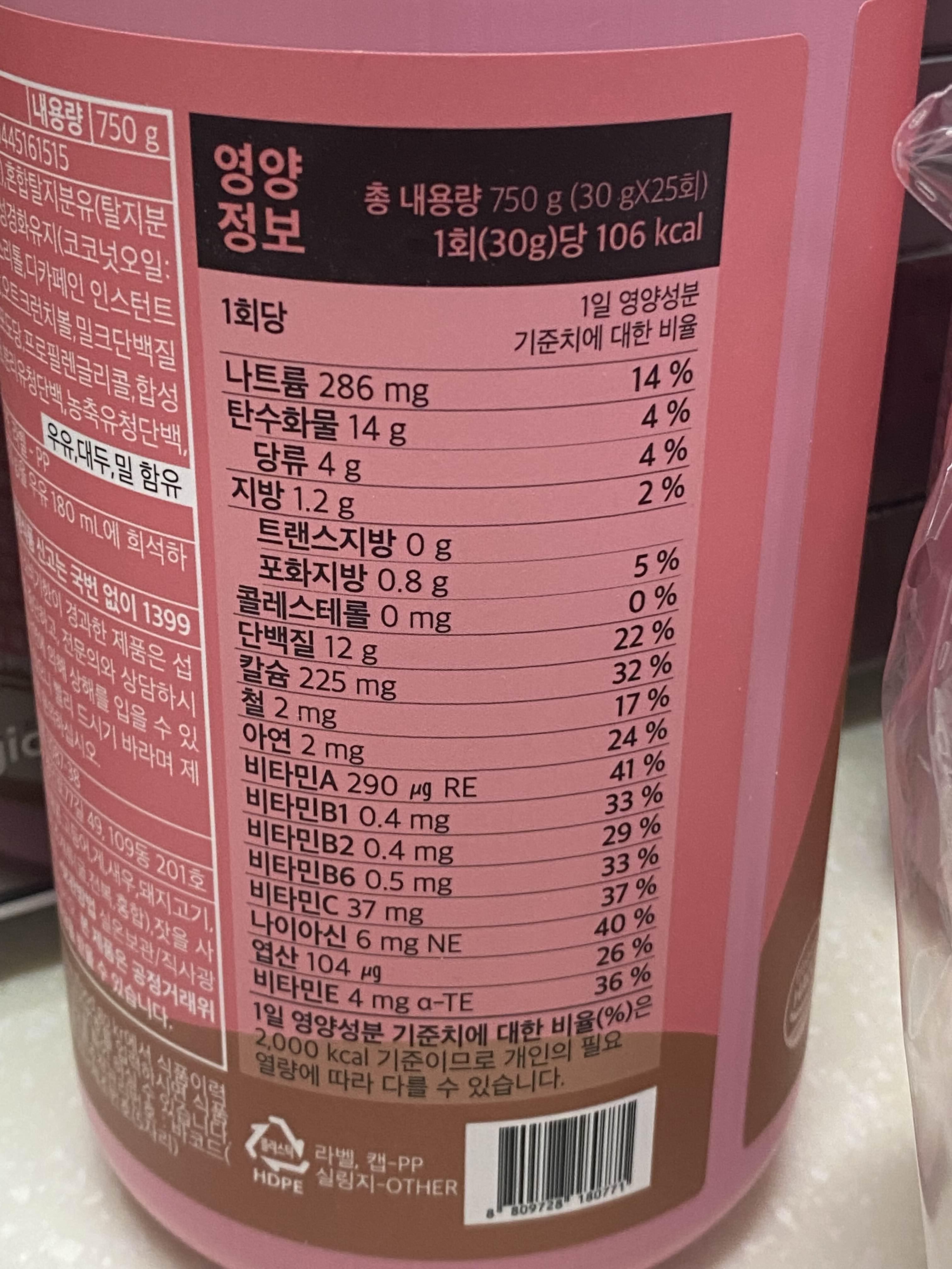 지금 다시보니까 카페라떼맛의 칼로리가 곡물맛보다 조금 낮네. 총 750g인데 한번 섭취할 때 30g씩 먹는다. 총 2,650kcal니까 한끼에 30g, 110kcal를 섭취하는걸로 생각하면 되겠다. 거기에 두유나 우유 칼로리 추가!
