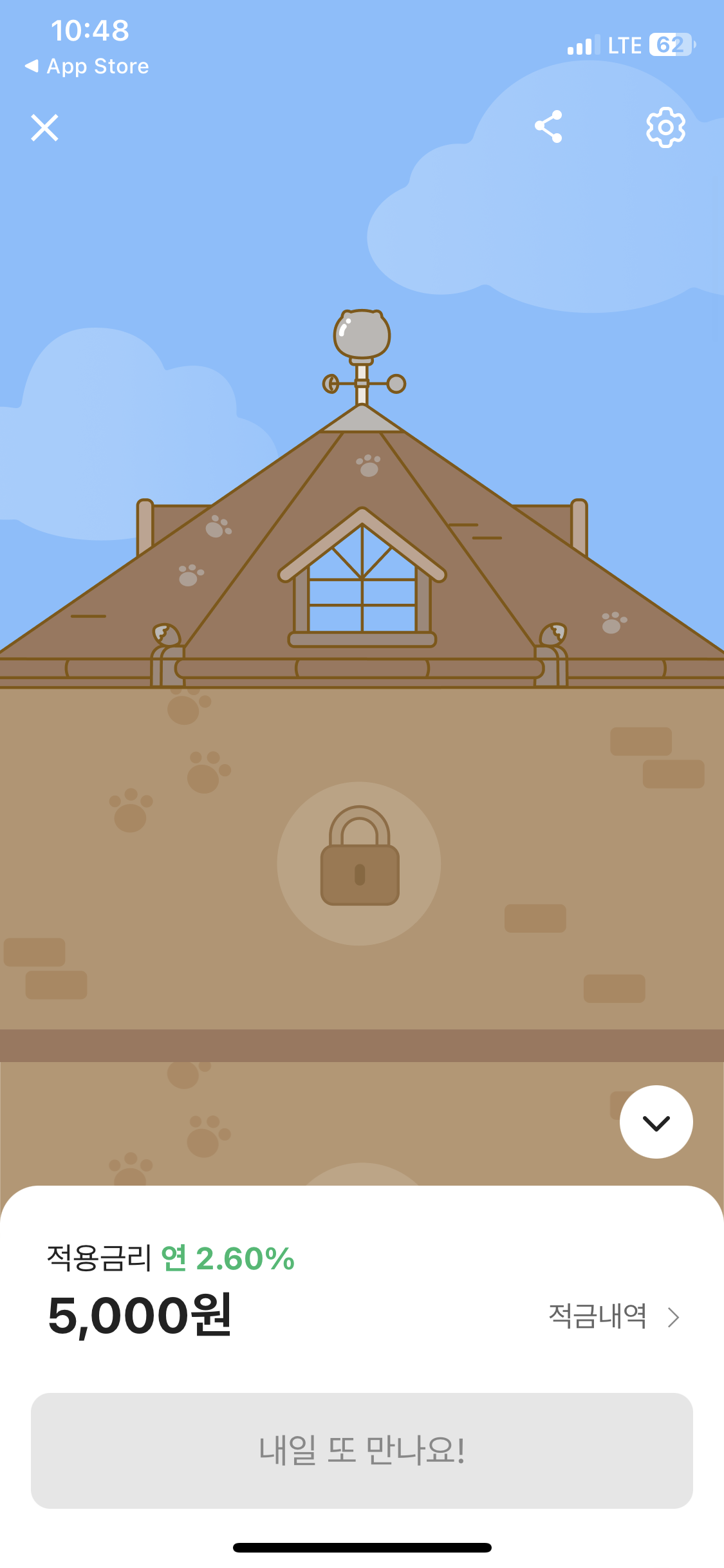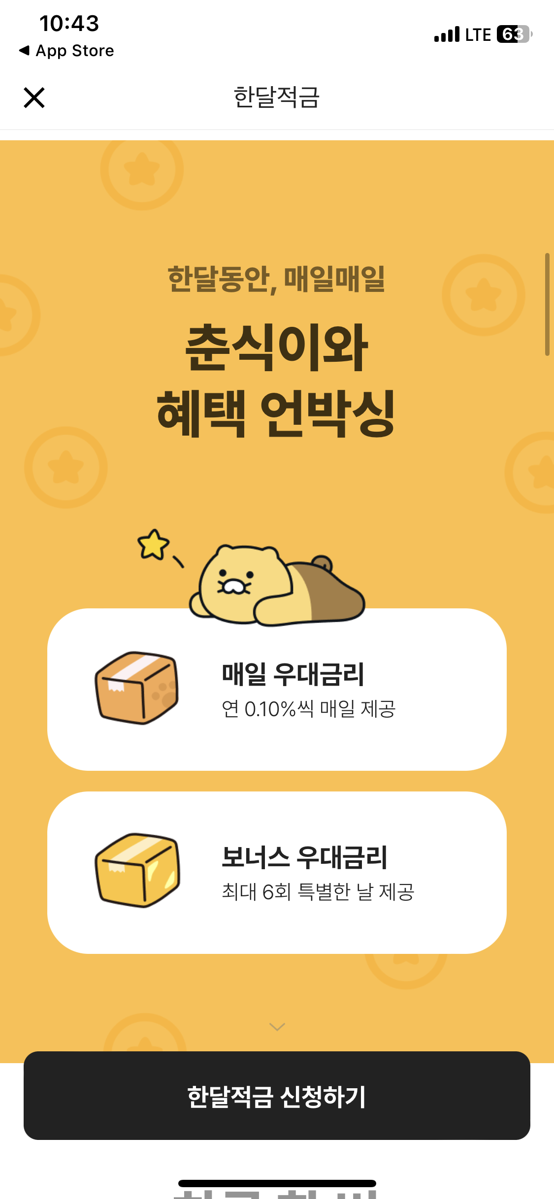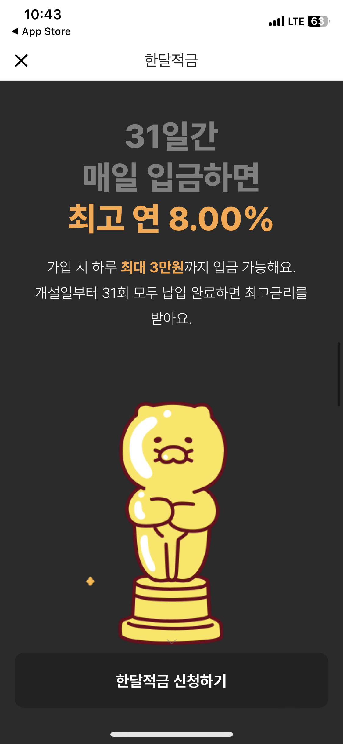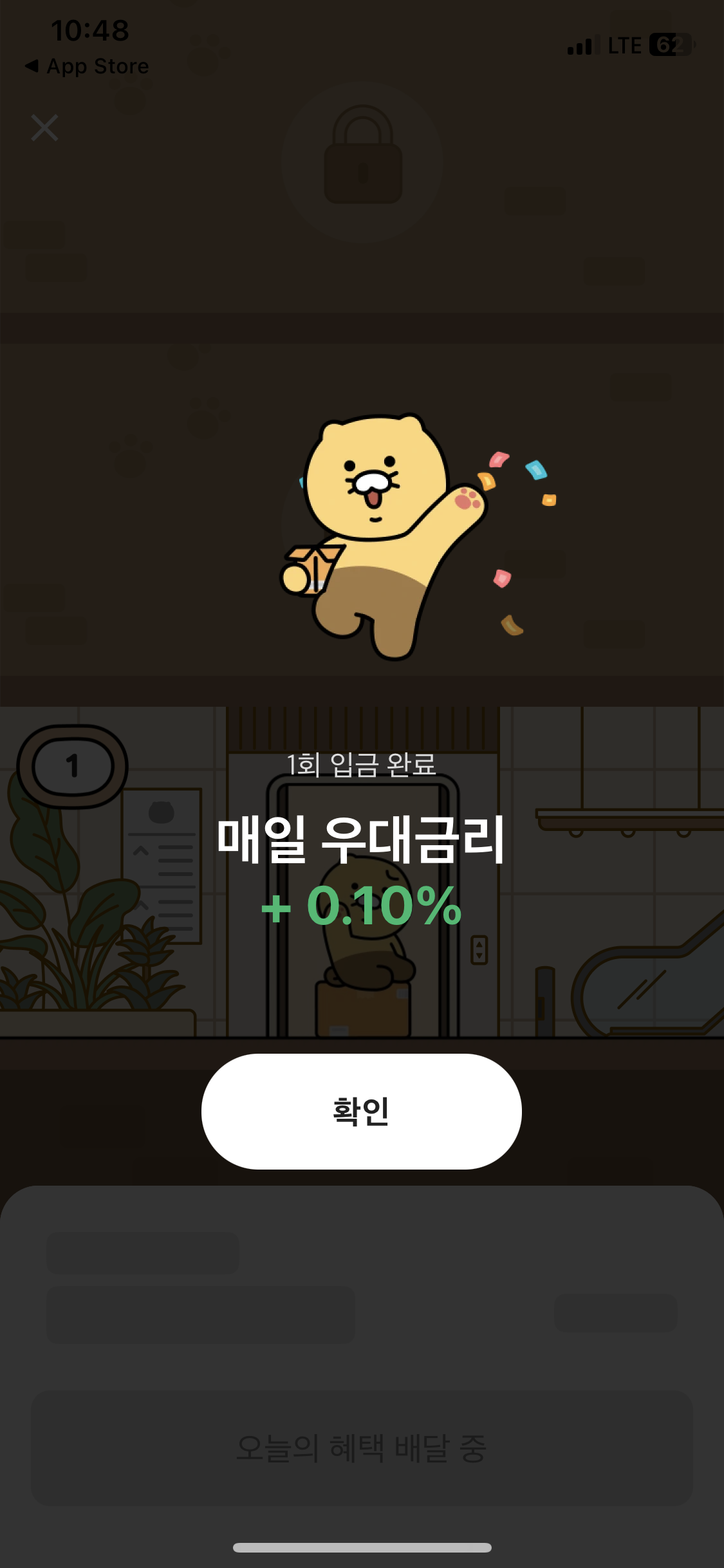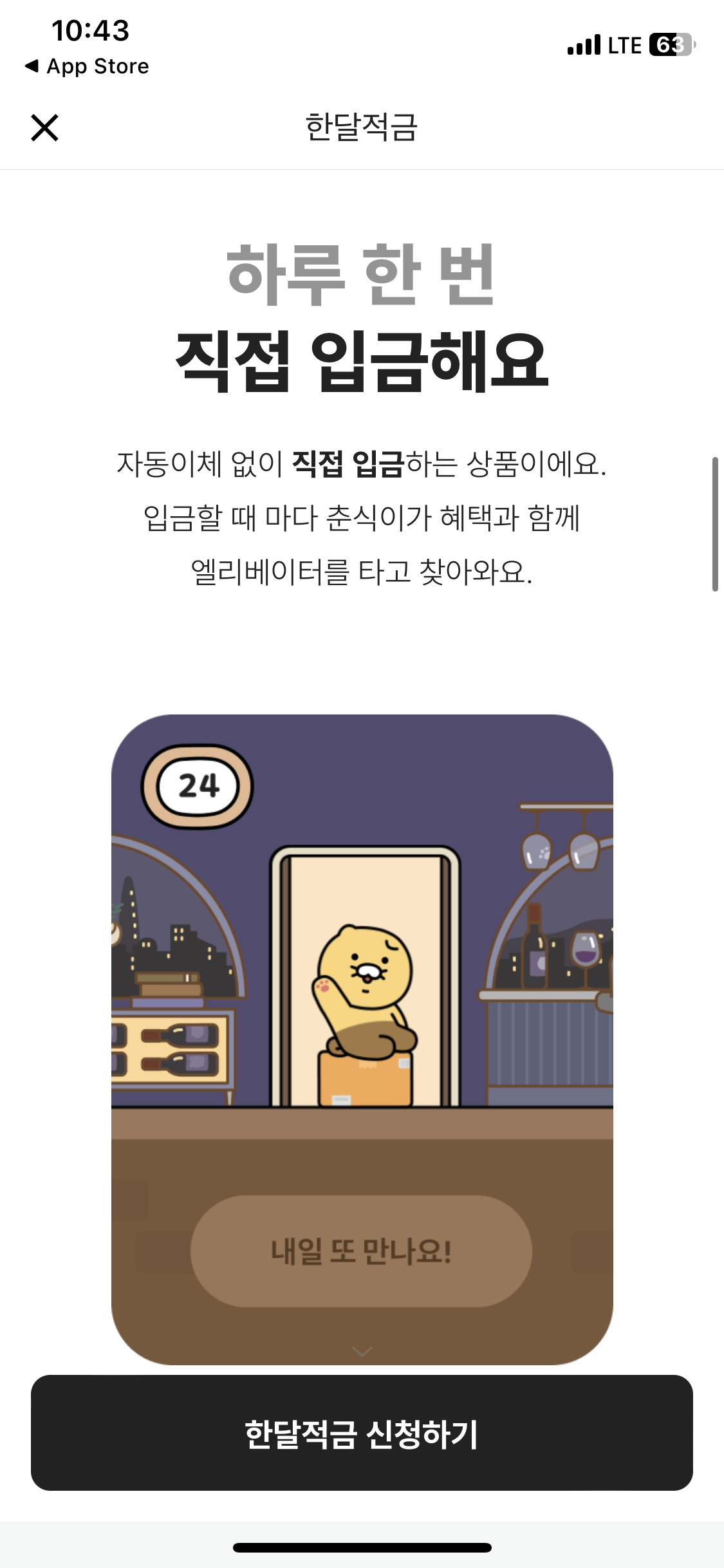 적금을 누르면 위와 같은 화면이 뜨고 입금하기를 누르면 우대금리와 함께 춘식이가 1층에 도착한다. 내일도 입금하면 우대금리 0.1%를 받고 춘식이를 2층에 올리는거다.