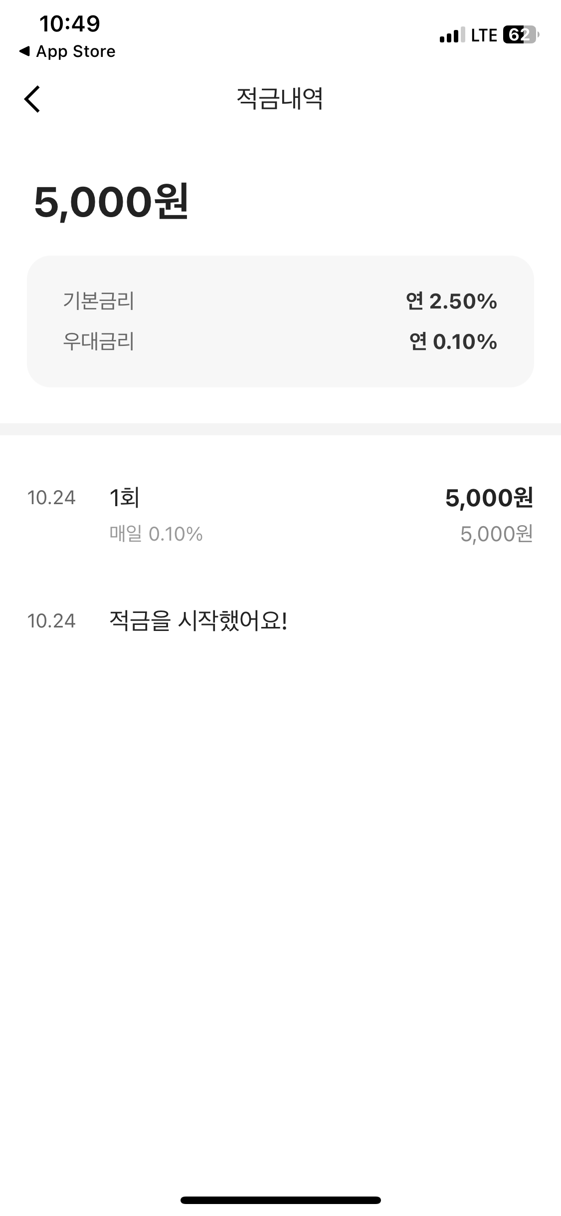적금내역을 누르면 입금한 날짜와 금액, 금리를 확인할 수 있다. 까먹지말고 매일 납입해서 꼭 최고금리를 받고 말거다!