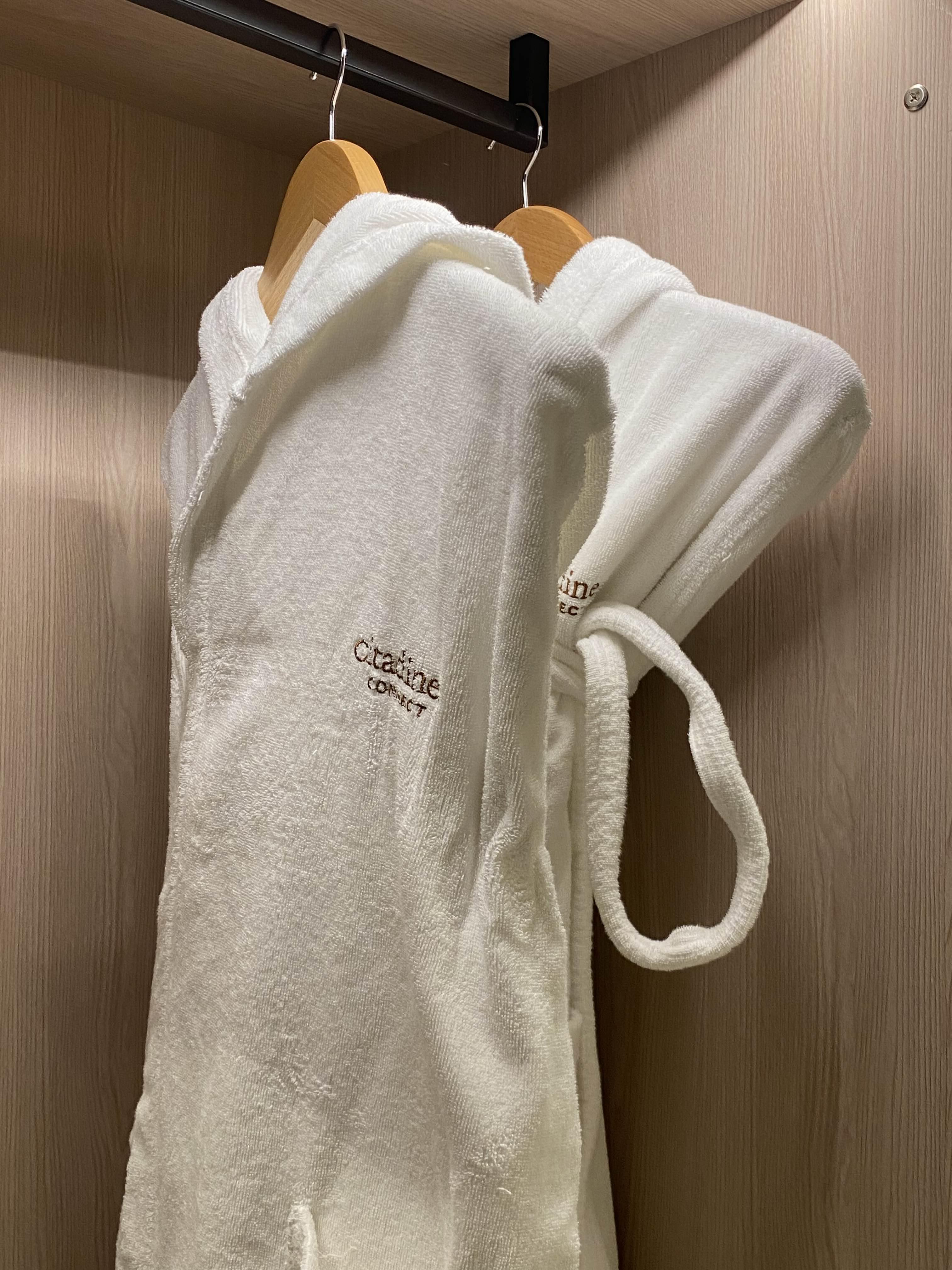 일회용 슬리퍼 두세트, 가운 두벌! 하나 입으려고 풀었다가 결국 안입고 저렇게 두고왔다. 이럴거면 풀지도 말걸ㅎㅎ.. 가운도 컨디션이 매우 좋다. 신축이라고 하니 가운도 새거에 가까울듯