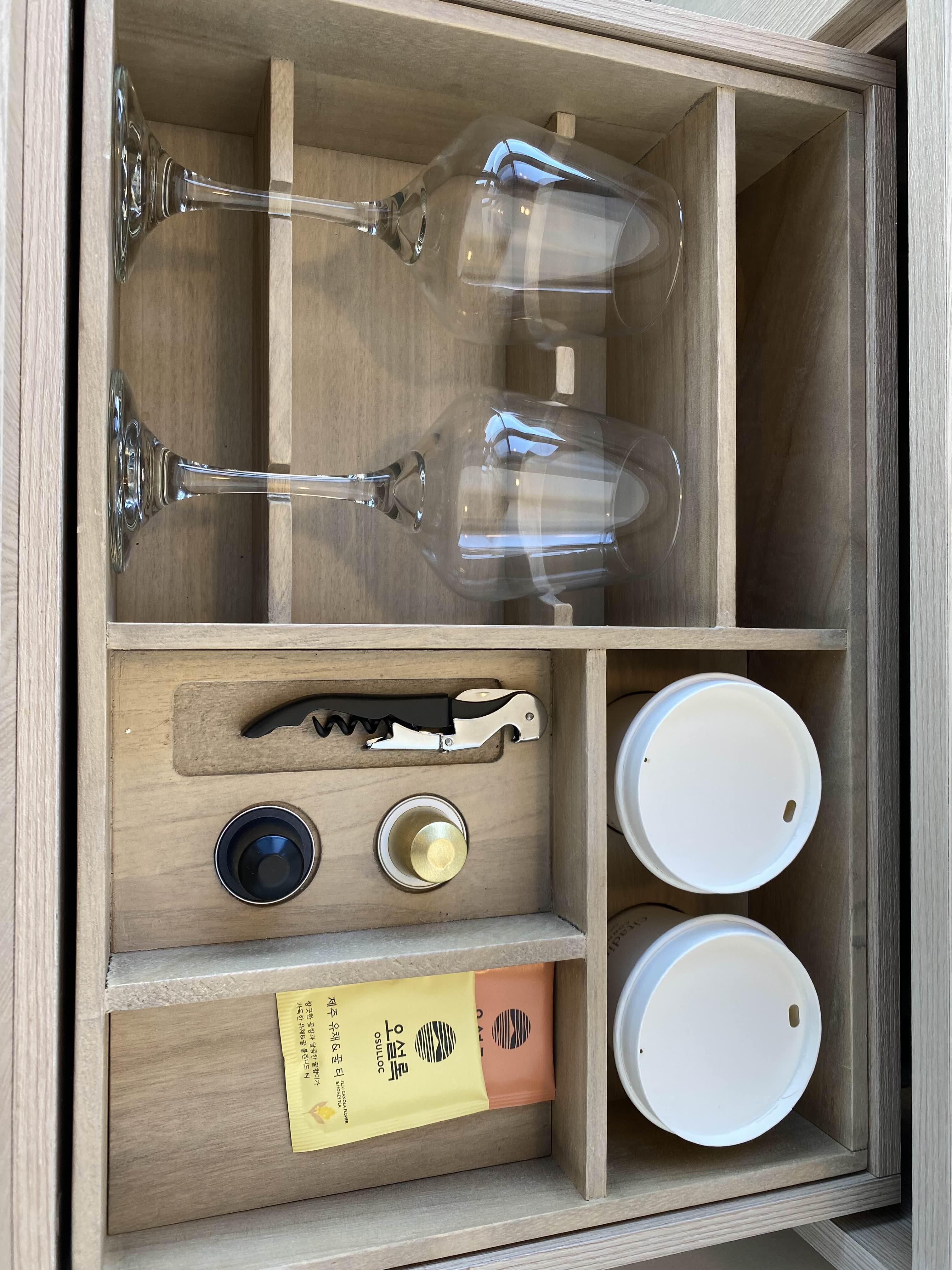 와인잔도 두잔 있고 와인오프너도 있다! 오설록 티 진짜 맛있는데..!!! 티백도 두개 있다. 아주 알차게 좋은것들로만 있다.