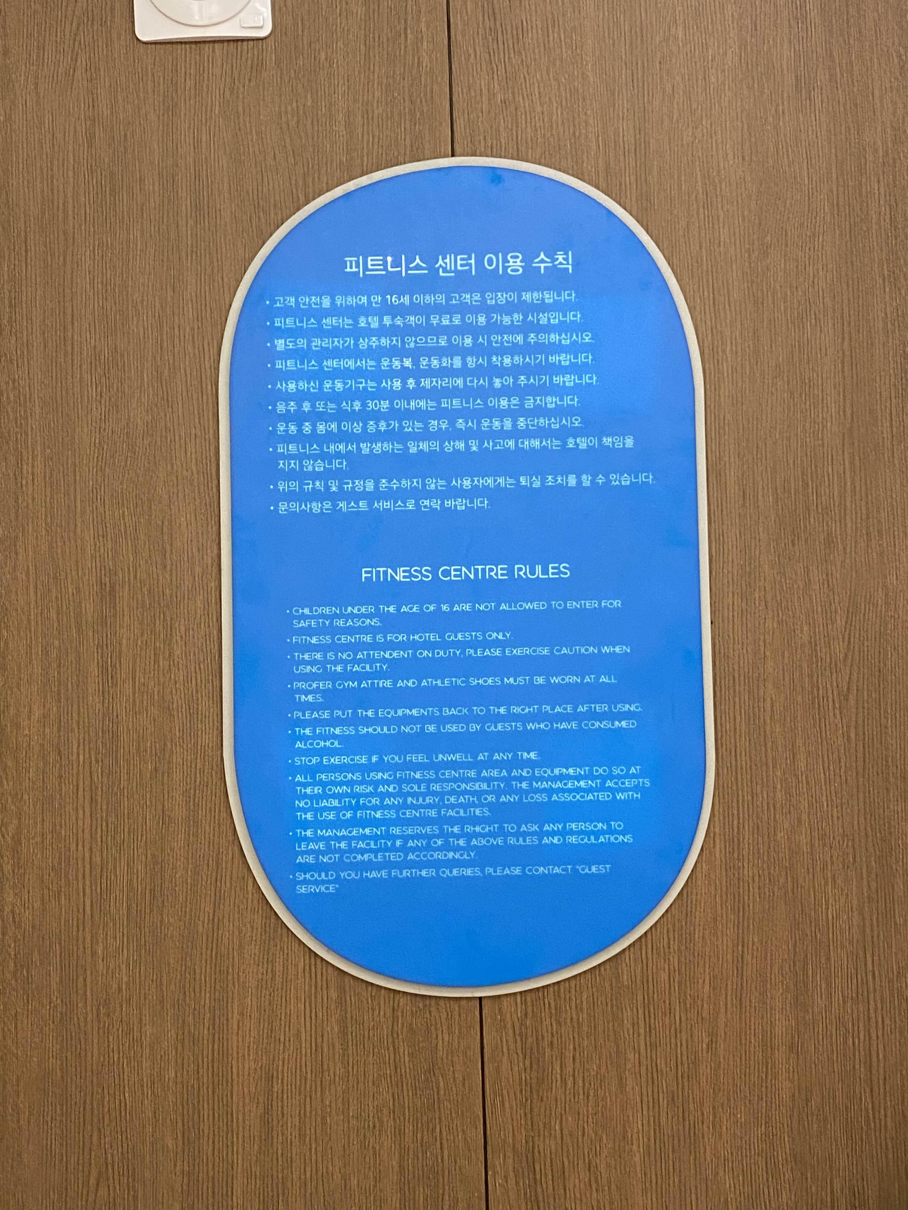 피트니스센터는 오전 7시부터 오후 10시까지 이용할 수 있다고 한다. 체크인할 때 여쭤봤었는데, 비밀번호를 알려주셨다. 2층에 위치해있는데 식당도 있어서 아마 호텔 이용하는 사람이 아닌 사람이 이용할 수 없게 잠금장치가 있는거 같다.