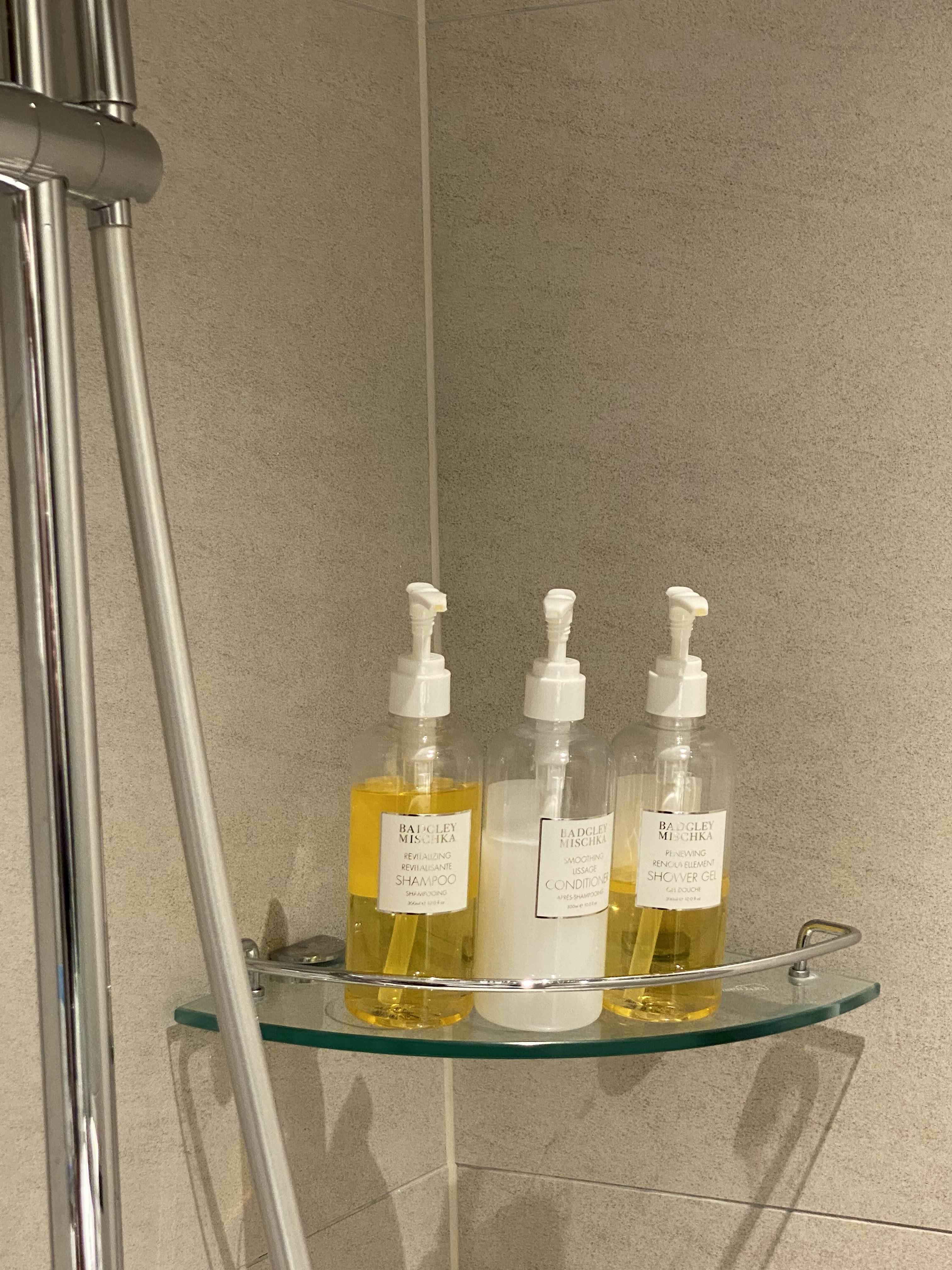 화장실 매우 깨끗했다!! 오른쪽에는 핸드워시와 바디로션이 있었다.