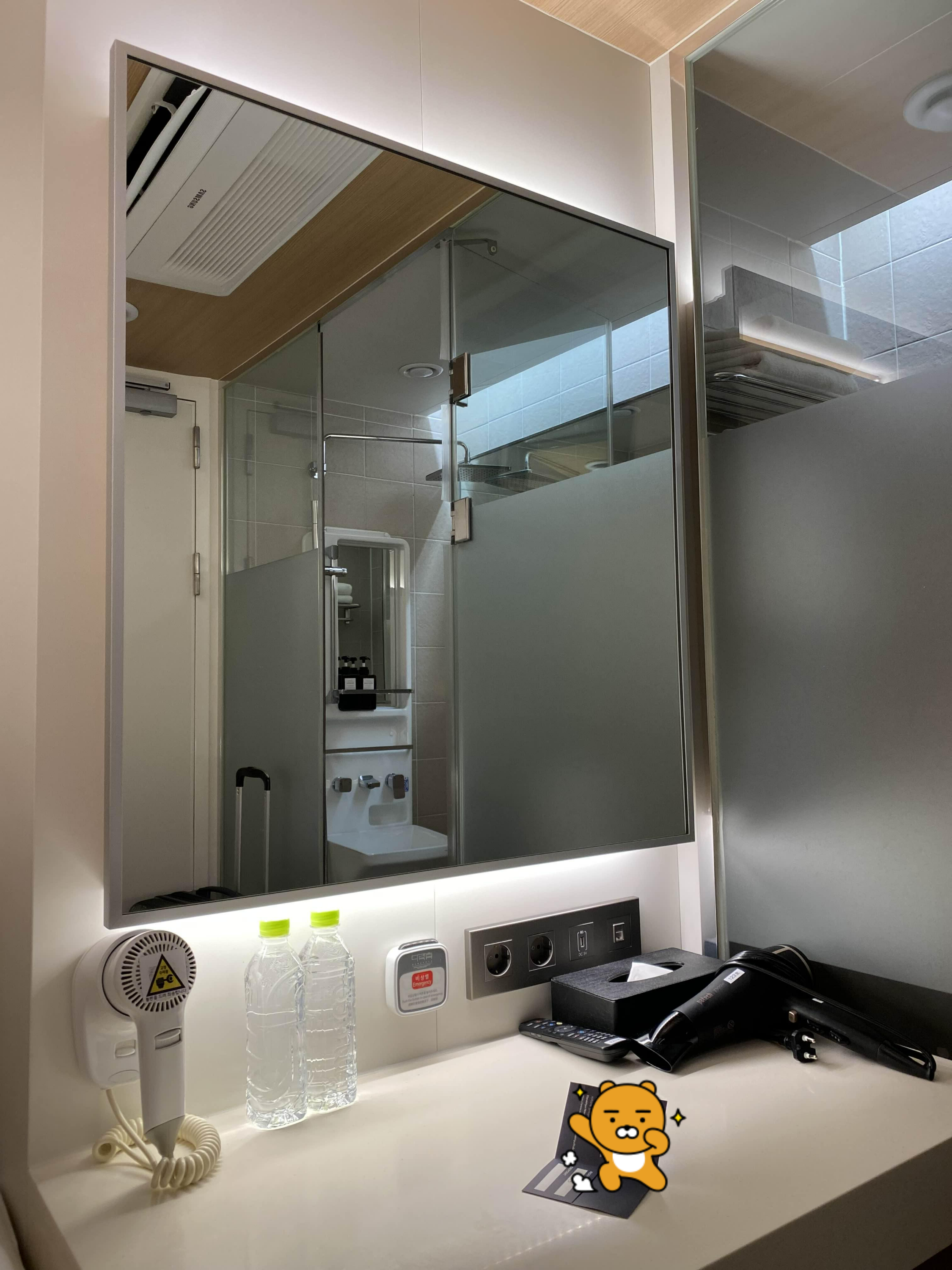 생수 두개가 제공된다. 내가 갔을 때는 왼쪽의 헤어드라이기가 고장나있어서 따로 제공이 되어있었다.