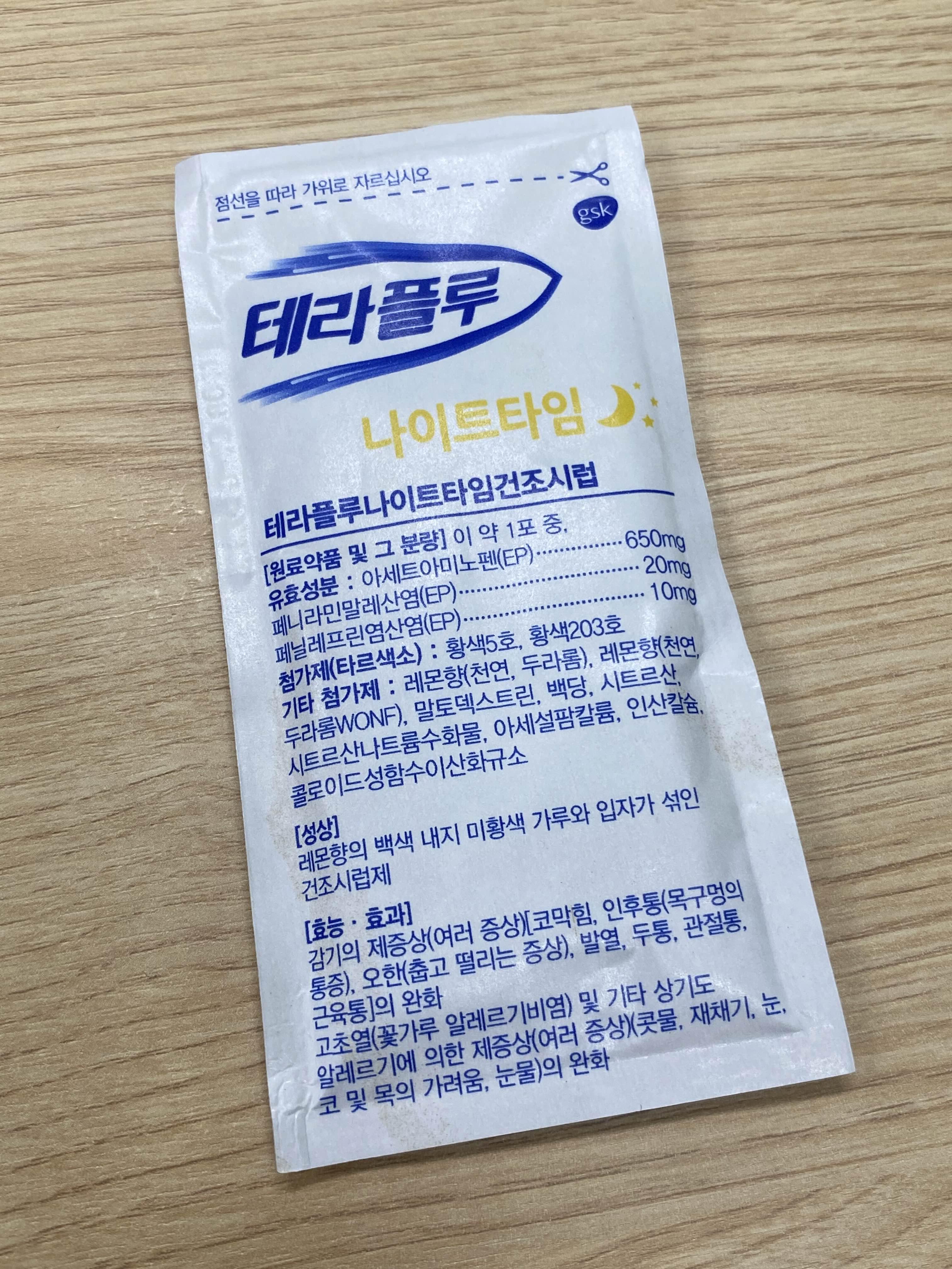 회사에는 테라플루 나이트타임이 있었다. 레몬향이 나는 감기약으로 따듯한 물에 타먹으면 된다.