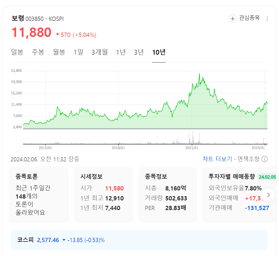 보령이라는 회사가 어떤회사인지는 이제 알아봐야... 바이오업체인거 같은데... 뭐 당첨되서 받은건데 굳이 팔필요까지는 없을거같다! 3년전쯤 2만원까지도 올라갔던거네!