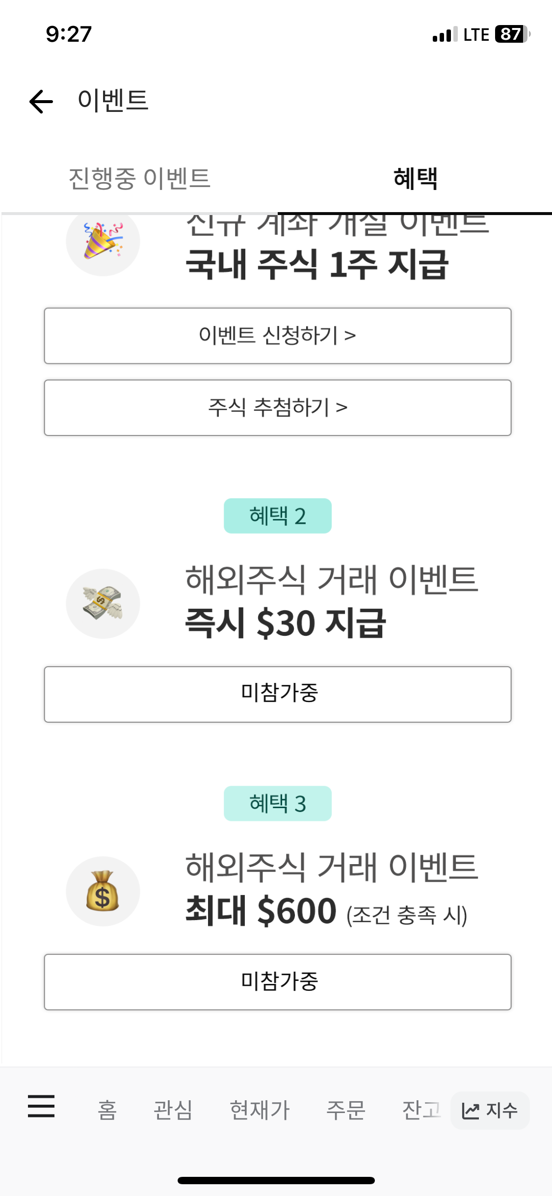계좌를 개설하고 어플에서 이벤트를 신청하고 주식 추첨하기도 눌러줘야 한다. 돈이 좀 있으면 해외주식 이벤트도 하고 싶긴 한데.... 지금 당장은 여유가 없다 ㅠ