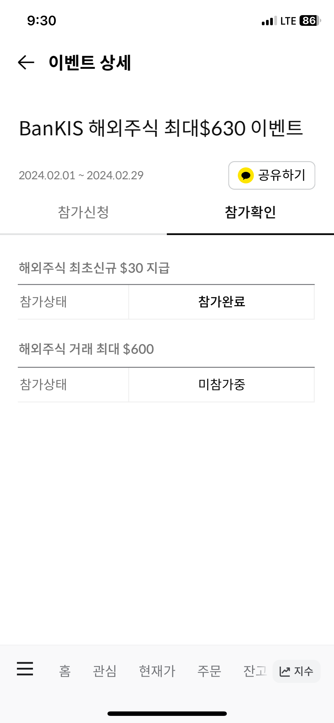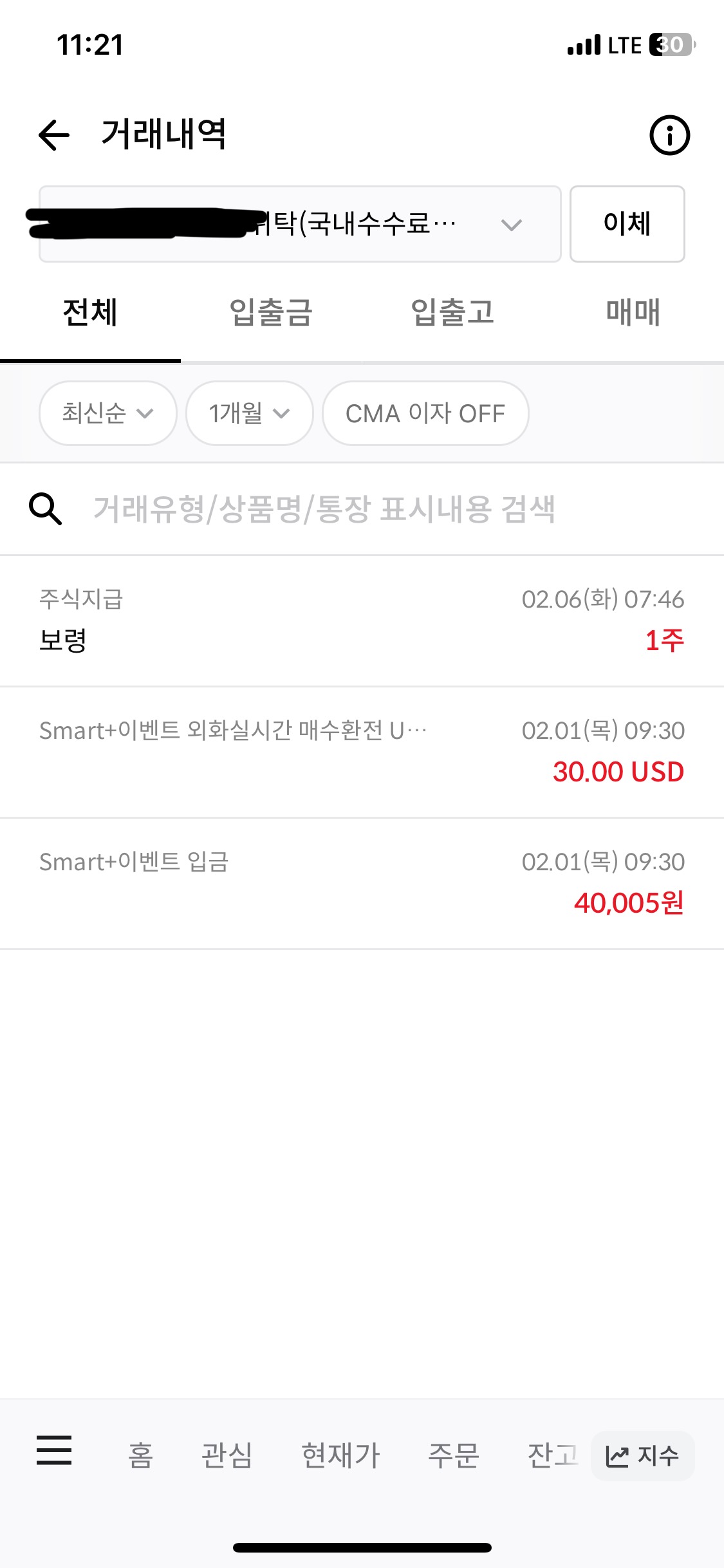 계좌를 개설하고 이벤트를 신청하고 30달러를 지난주 목요일, 그니까 2월 1일에 받았는데, 오늘 아침에 문자가 하나 왔다.