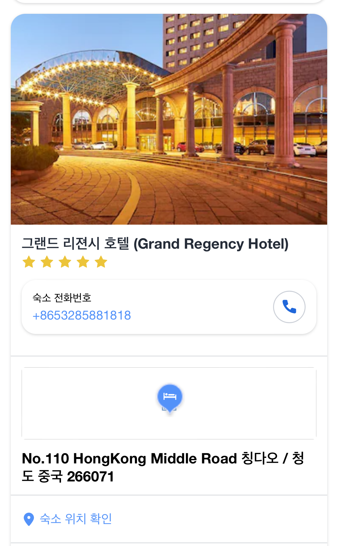 호텔 주소: No.110 HongKong Middle Road 칭다오 / 청도 중국 266071