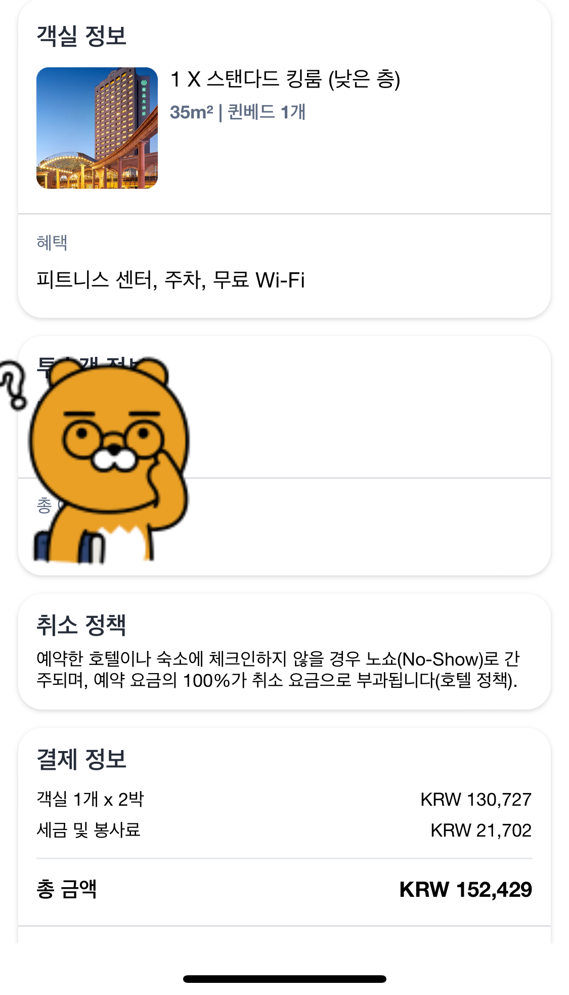 피트니스센터도 있다고 하는데, 갈 시간이 없었다. 너무 아쉽다. 아고다에서 최저가로 조식 미포함 옵션으로 2박에 152,249원을 결제했다. 1박에 8만원 안되는 값인데, 욕조도 있고 방이 넓어서 좋다고 생각했다.