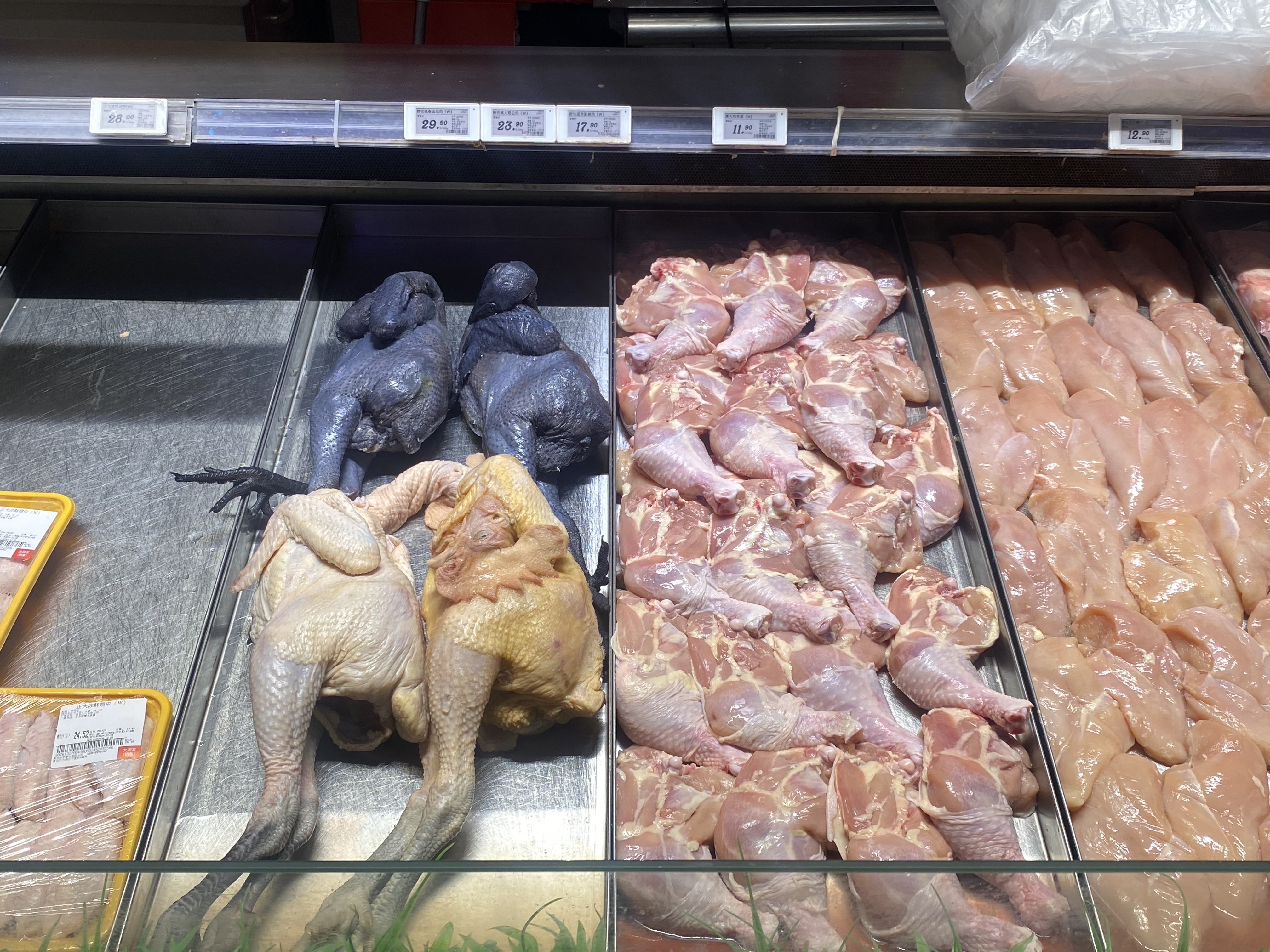 정육코너에서는 까만색 닭..? 닭인가 저게..? 아무튼 피부가 까만 새를 판다. 처음보는 음식재료...