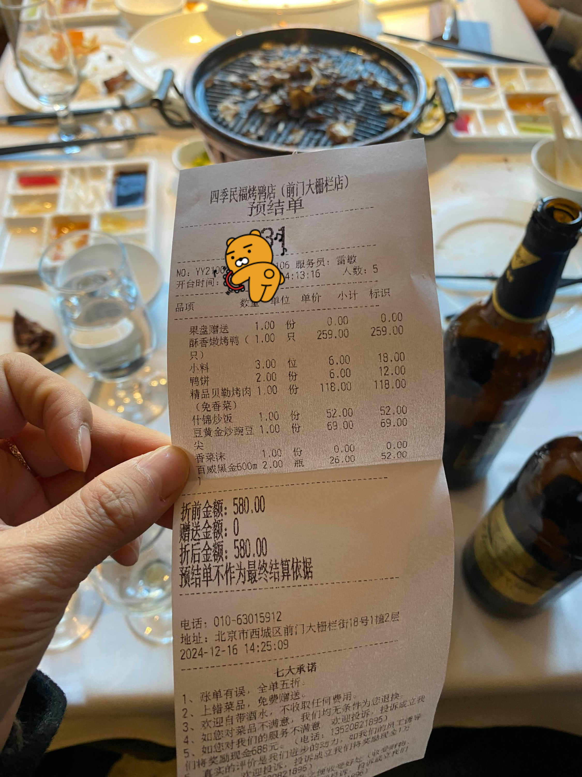아무튼 5명이서 총 580위안이 나왔다. 한국돈으로 11만 5천원 정도! 중국 물가에 비하면 비싼 식사긴 하지만, 식당이 고급스럽고 서비스가 좋고 음식의 퀄리티도 매우 좋아서 이정도면 너무 만족스러운 식사라고 다들 좋아했다.