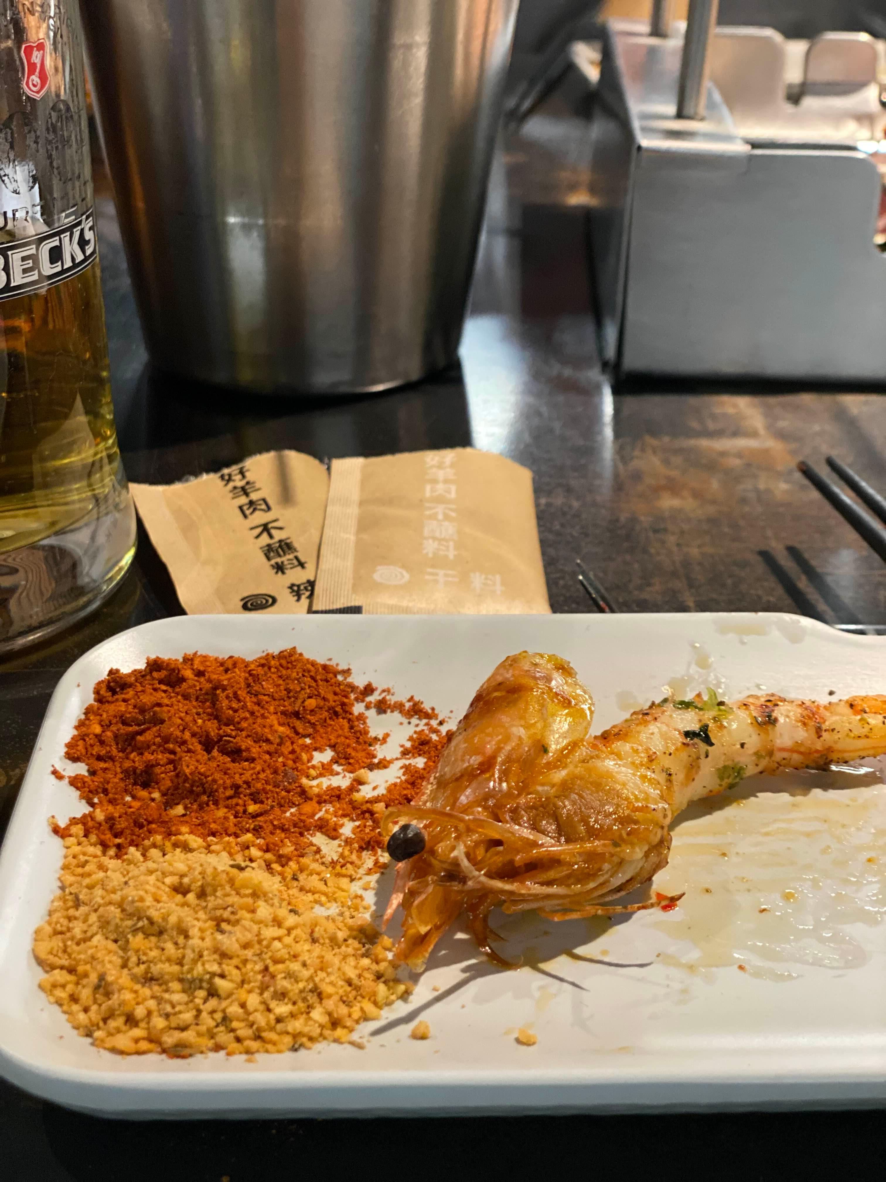 메뉴판에는 한국말로도 써져있긴한데, 구글 번역기로 번역해 놓은 느낌이라 ㅎㅎ 참 재미있다. 오른쪽 제일 위에 있는 12개 양꼬치는 무조건 주문하고, 추가로 뭘 할까 고민하다가 껍질없는 새우를 하나 주문했다. 갯수를 다시 물어봐서 하나만 달라해서 먹어봤는데 진짜 너무너무 맛있었다. 그래서 나중에 열마리 다시 주문했다.