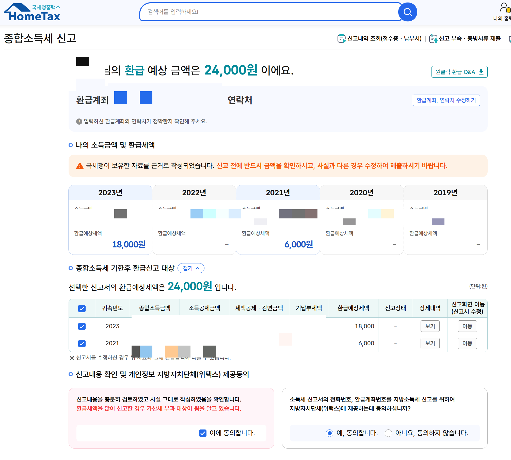 근데 그래도 혹시 모르니 조회나 해볼까 하고 홈택스에 들어갔다. 들어가보니 24,000원을 환급해주겠다고 한다. 그것도 2021년, 2023년도꺼를!