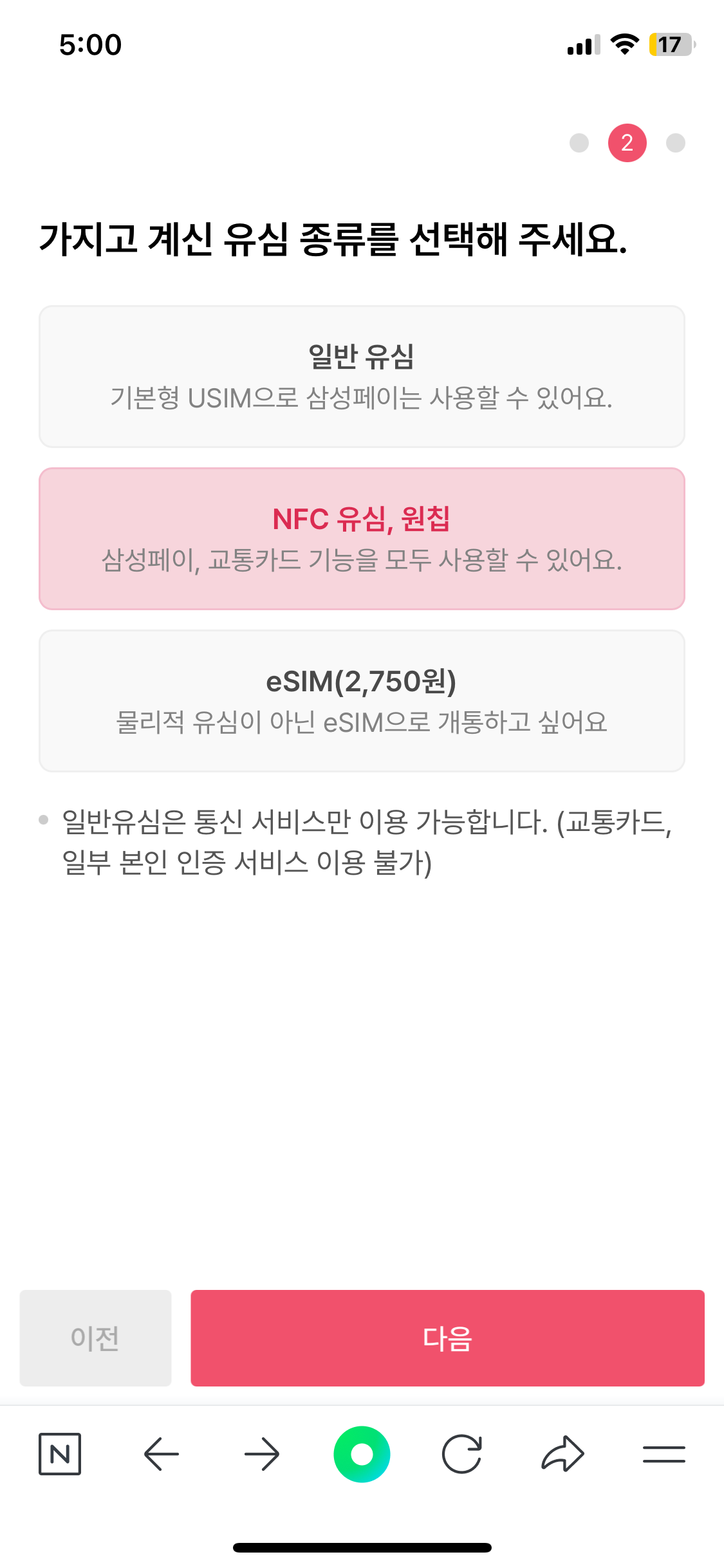 유심칩을 이미 배송받아 가지고 있으니 가지고 있다고 선택한다. 만약에 유심칩을 미리 구매하지 않은 사람은 구매할래요를 클릭하면 유심칩을 배송해준다. 유심을 받고나서 같은 절차를 진행하면 된다.