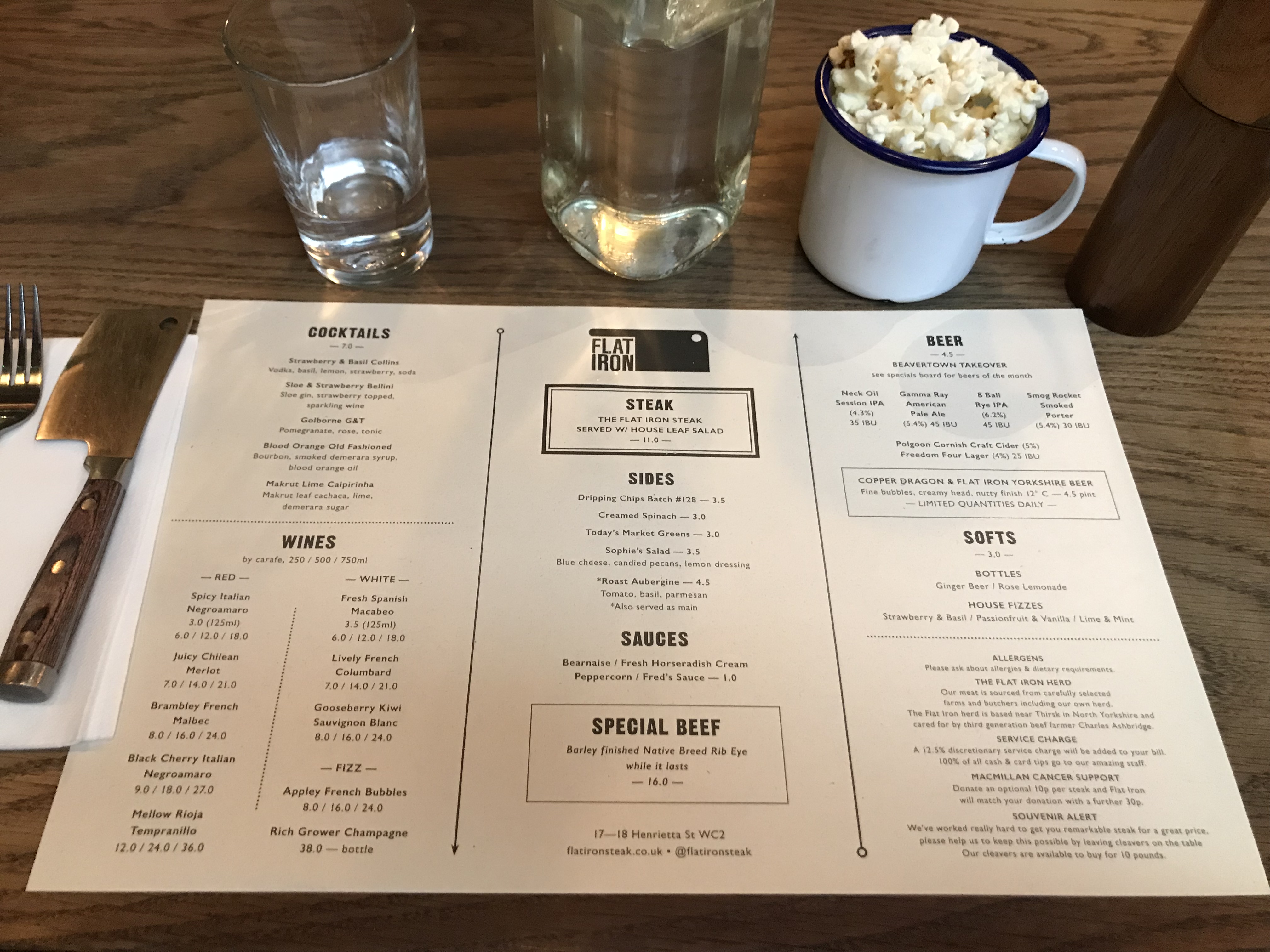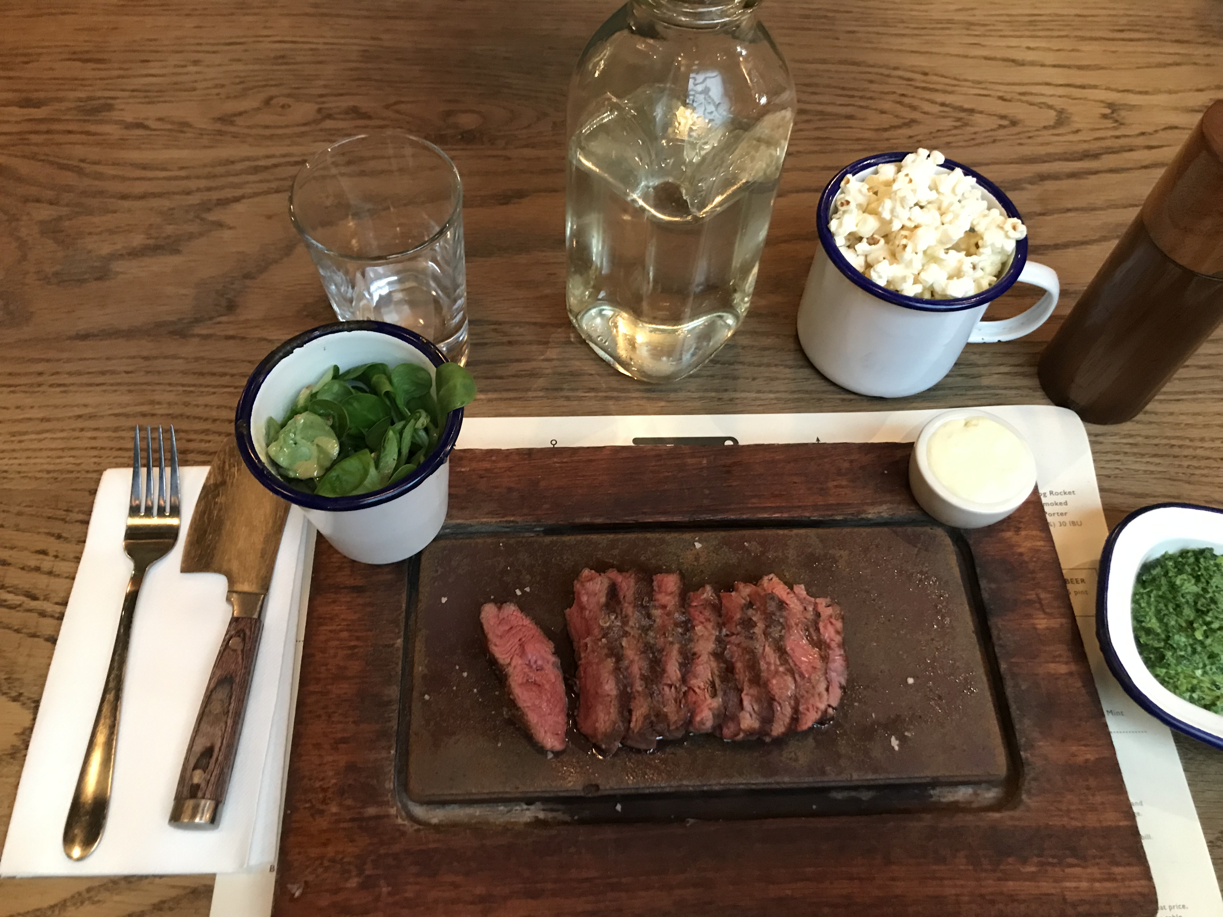메뉴판을 주면서 물과 팝콘, 그리고 포크와 나이프를 줍니다. 플랫아이언의 나이프는 도끼모양으로 유명합니다. 스테이크도 잘썰리고 귀엽게 생겼습니다. 저는 스테이크에 사이드 디시로 Creamed Spinach (크림 시금치)를 선택했습니다. 샐러드는 영국이라고 다를 것 같지 않았고, 크림시금치는 맛이 궁금했기 때문입니다. 아 그리고 스테이크에 곁들여 먹을 소스를 두번째에 위치한 fresh horseradish cream을 선택했습니다. 개인적으로 고기먹을 때 와사비를 즐겨 먹는데, horseradish가 서양고추냉이라고 해서 선택하게 되었습니다.