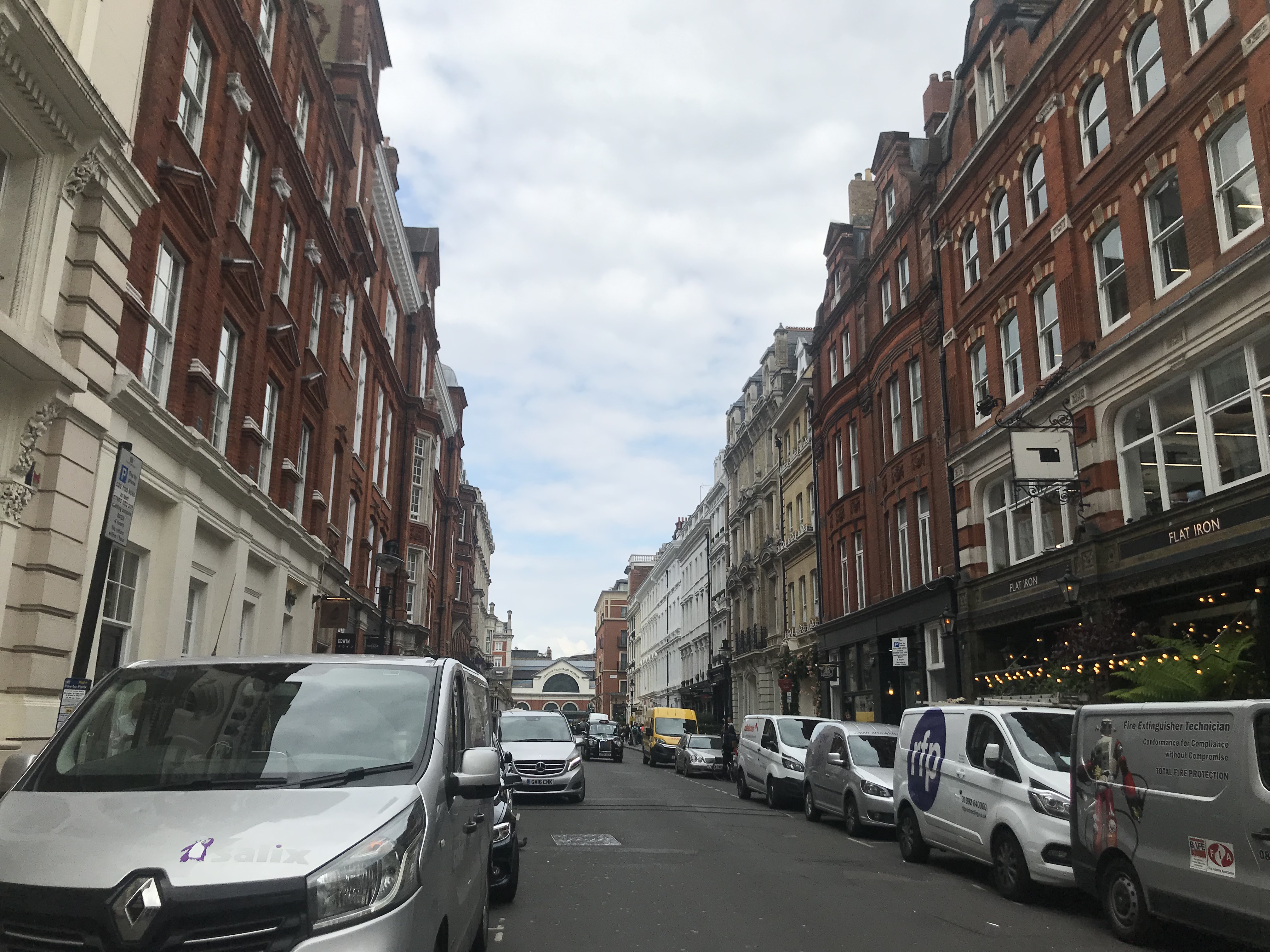 저는 오이스터카드를 이용하여 언더그라운드를 타고 Charing Cross Station에서 내려서 걸어갔습니다. 이 골목의 오른쪽 조명있는 가게가 flat iron입니다. 코벤트가든과 매우 가깝습니다.
