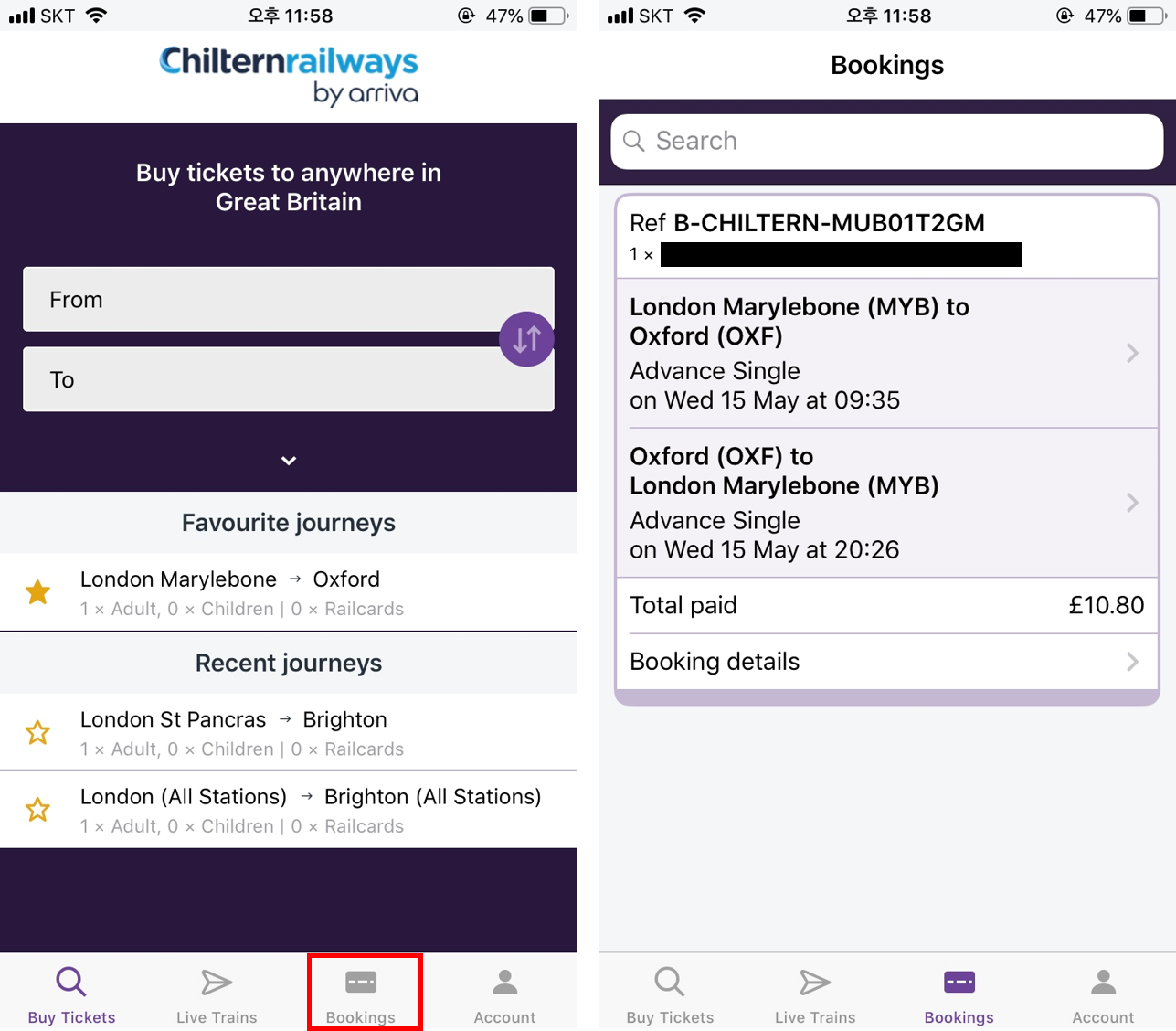 최근 검색기록과 중요표시한 티켓을 바로 확인할 수 있어요! 그리고 아래쪽 세번째 배너인 Bookings를 들어가면 예약한 표를 확인할 수 있습니다! 가격까지두요~ 저는 10.8파운드에 예약했네요! 예약당일 환율로 16543원에 결제했습니다! 확실히 일찍 예약하는게 싸네요 ㅎㅎㅎ 그새 약 4파운드 정도 올랐어요ㅠㅠ 한국돈으로는 6000원 정도..? 큰 돈은 아니지만, 한푼이라도 아껴서 맛있는거 한번 더 먹고 오려는게 제 목표예요 ㅎㅎㅎ 저는 약 두달 전에 예매했습니다!