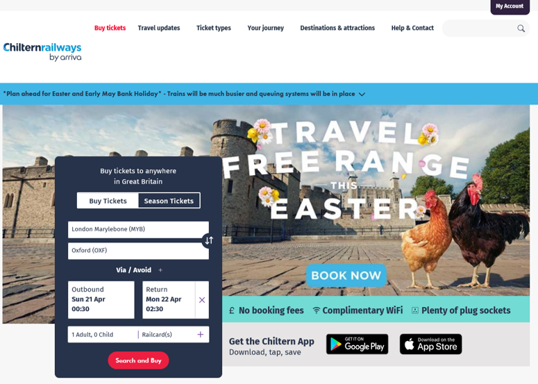 이렇게 기차, 버스, 비행기가 각각 어떤시간대에 얼마정도에 구매할 수 있는지 시간은 얼마나 걸리는지 다 확인할 수 있답니다. 저는 런던에서 옥스포드로 왕복을 알아보는데 보시다시피 비행기는 비활성화가 되어있지요? 기차와 버스를 이용해서 갈 수 있답니다. 저는 기차를 선택하려고 해요. 기차 중에서도 Chiltern railway가 눈에 띄었고, 왠지모르게 끌려서 ㅋㅋㅋ 아예 공식 홈페이지로 예약하러 갔어요.