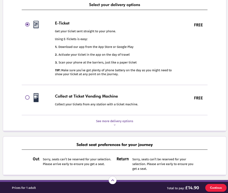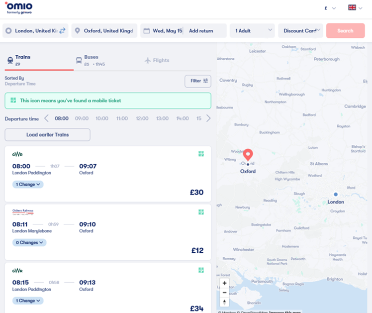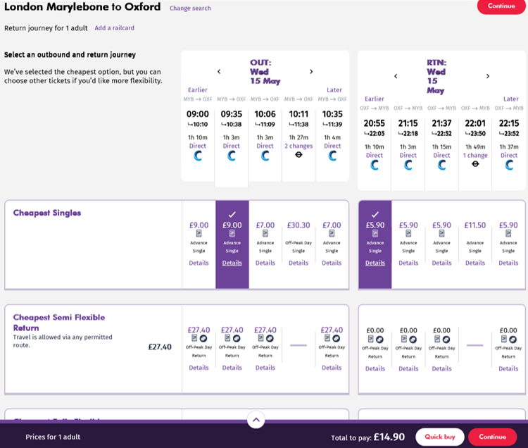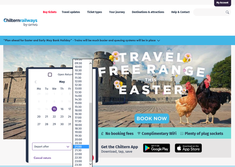 이렇게 Chiltern railways의 홈페이지를 들어가면 고유로와 마찬가지로 출발하는 역, 도착하는 역, 날짜 시간을 선택해주시면 해당 시간대의 티켓을 확인할 수 있어요.