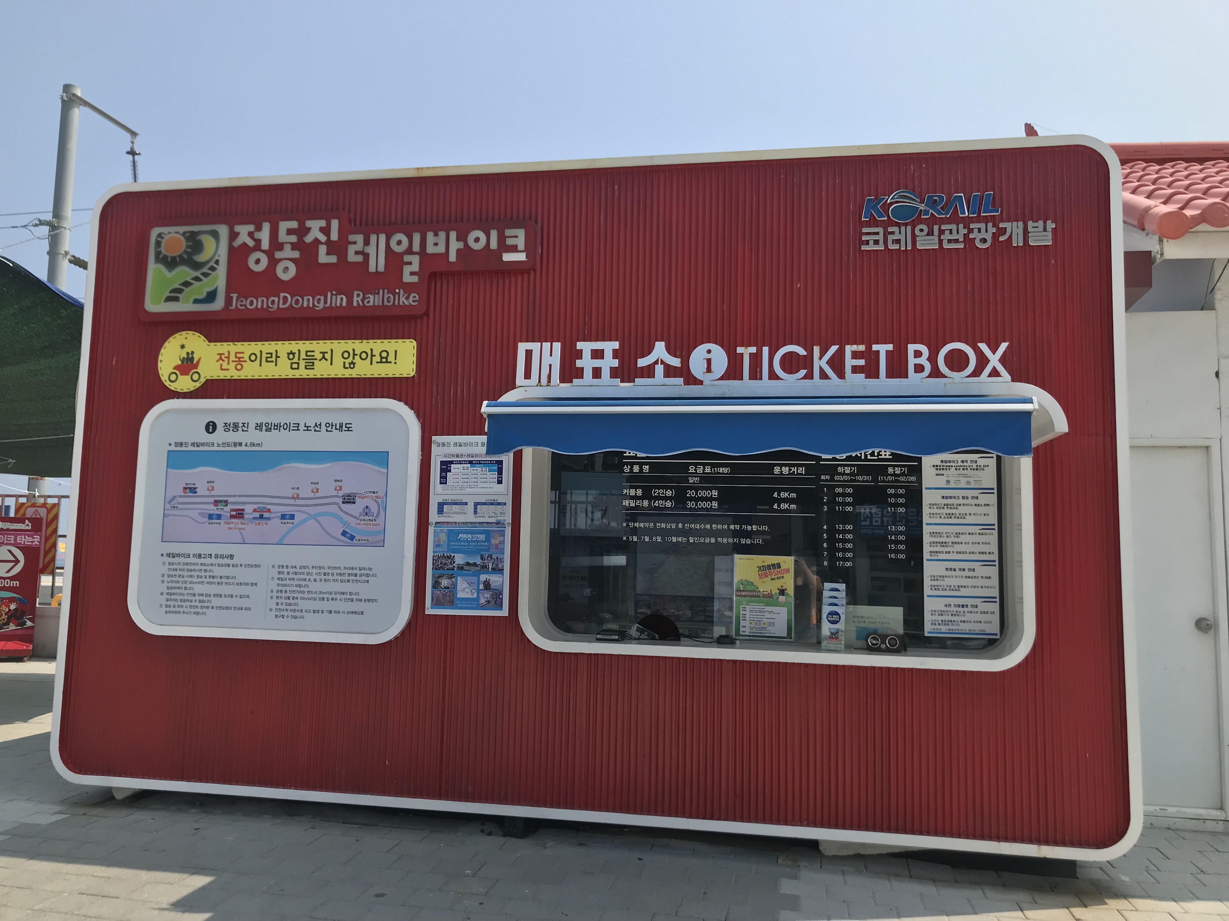 강릉 여행에서 가장 하고 싶었던 것 중 하나가 레일바이크였습니다. 더운 날씨지만 바람을 맞으면서 바다도 보고 시간을 보내고 싶었기 떄문입니다. 따로 예약은 하지 않고 매표소로 갔습니다. 매표소는 정동진역에서 걸어서 1분 거리에 위치하고 있습니다.