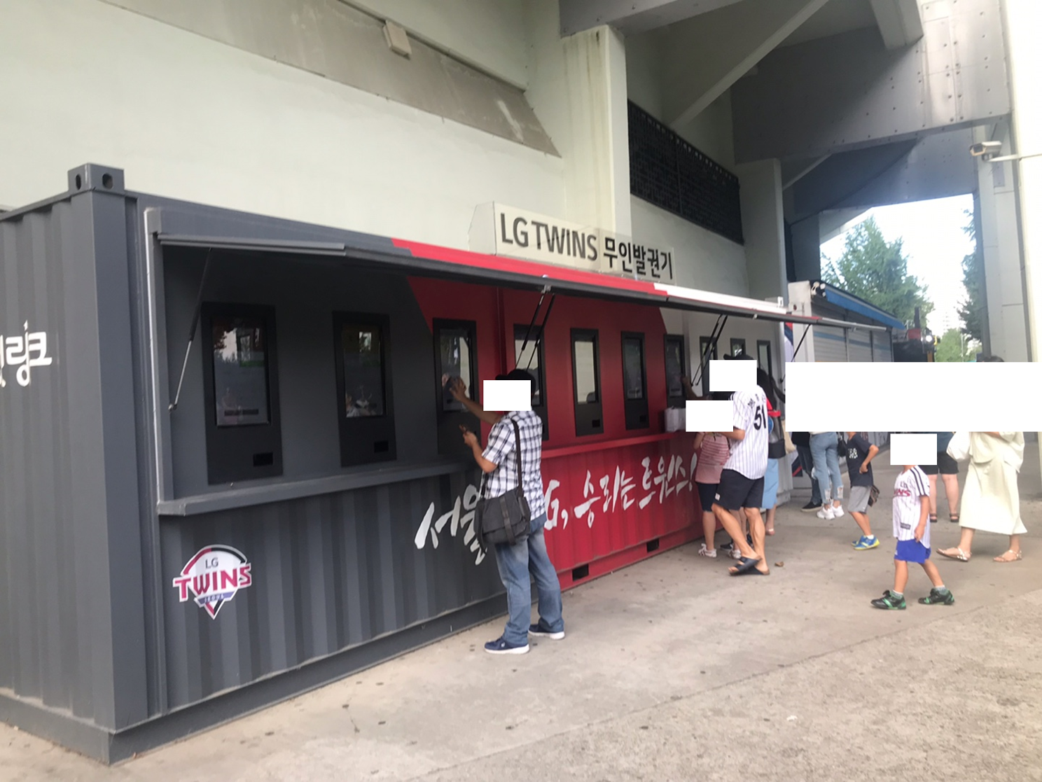 야구 관람을 위한 티켓팅은 인터넷으로 사전에 예약합니다. 예약한 사람의 전화번호를 위 사진의 무인발권기에 입력하면 티켓이 출력됩니다.