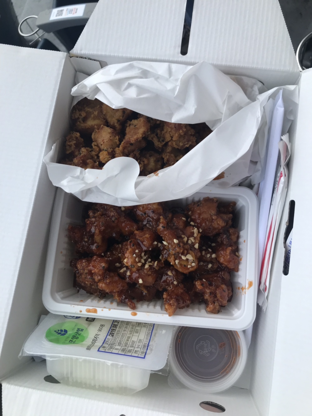 야구장에서 치맥을 빼놓을 수 없습니다. 저희는 솜리치킨을 주문해서 종합운동장역 5번출구에서 수령했습니다. 양념반 후라이드반에 배달비까지 20,500원 이였습니다. 양은 상당히 많아서 둘이 먹다가 남겼습니다.