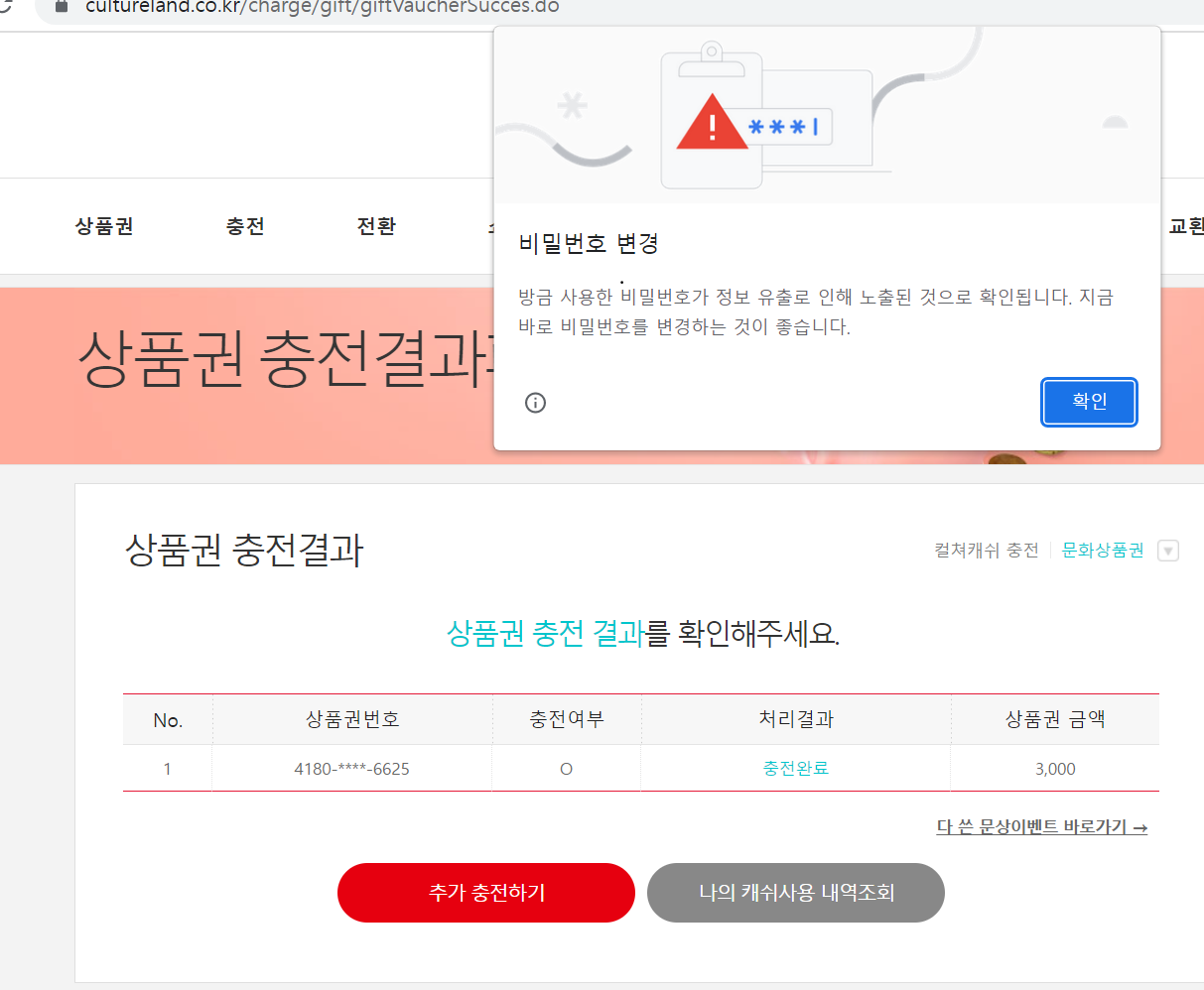 일단 충전은 됐는데, 충전하자마자 비밀번호 정보 유출로 노출된거 같다는 알림이 떴다. 꽤나 당황스럽다.