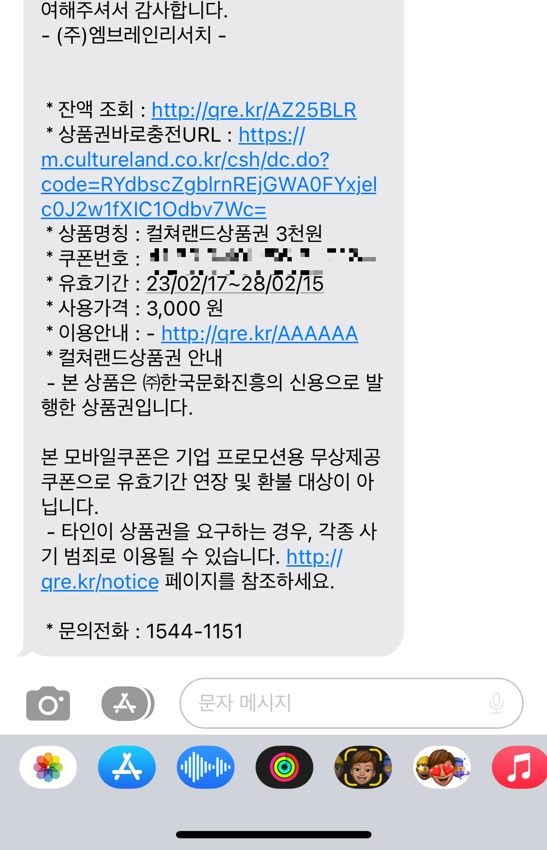 컬쳐랜드상품권 3천원은 아래 처럼 이미지 파일로 온다. 사진의 크기를 잘라서 안보이지만 아래 바코드와 바코드 번호가 있다.