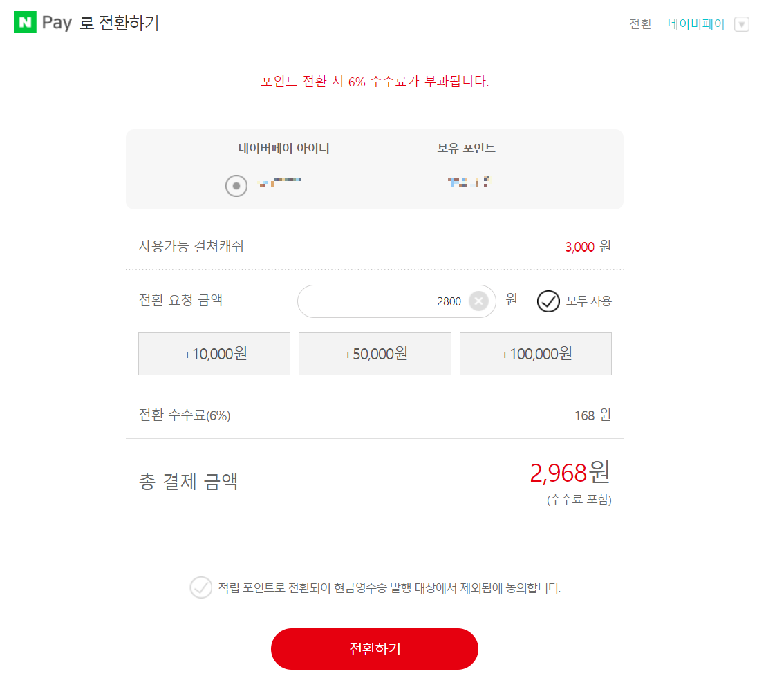 네이버포인트로 전환했다. 6%의 수수료가 붙어서 168원을 포함해 2,968원을 네이버 포인트로 전환했다. 네이버페이 포인트 알림도 바로 왔다. 그리고 현금영수증 발행 안됨!!!