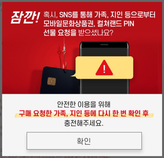 컬쳐랜드가 그 피싱 도구로 많이 사용되는 그 사이트였던거 같다. 구글포인트... 사서 번호 알려달라는 그 피싱 수법.. 절대절대 문자나 SNS로 상품권 번호나 선물요청이 오면 100% 피싱이라고 생각하는게 좋을거 같다.